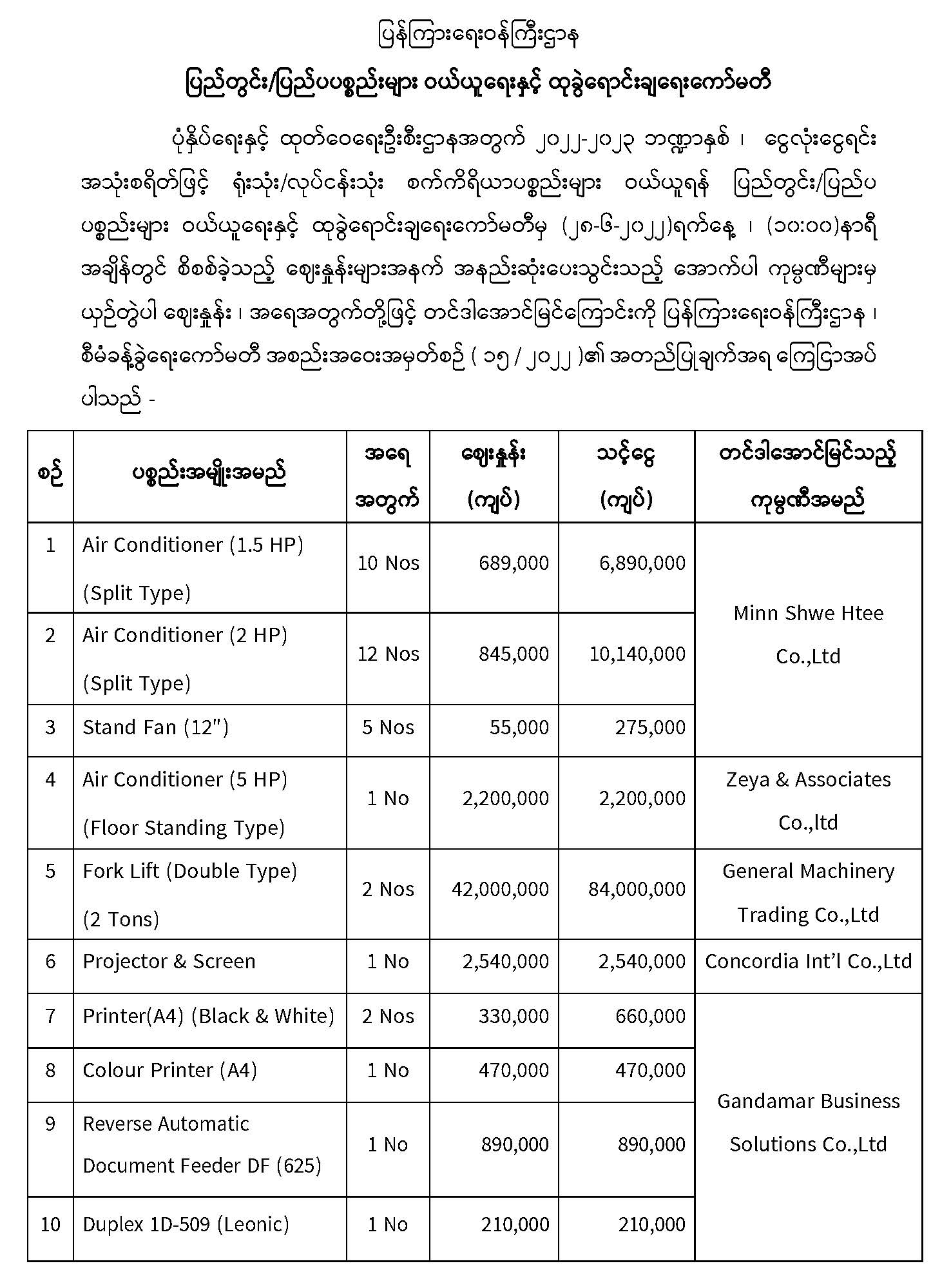 ပြည်တွင်း/ပြည်ပပစ္စည်းများ ဝယ်ယူရေးနှင့် ထုခွဲရောင်းချရေးကော်မတီ