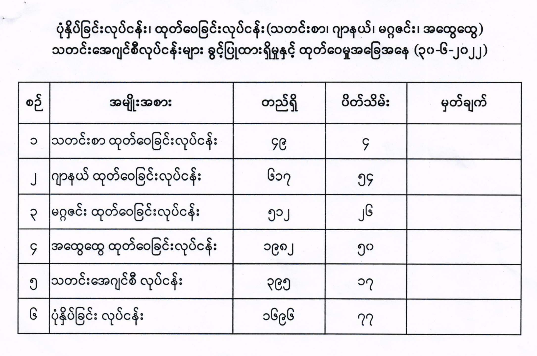 ပုံနှိပ်ခြင်းလုပ်ငန်း၊ ထုတ်ဝေခြင်းလုပ်ငန်း(သတင်းစာ၊ ဂျာနယ်၊ မဂ္ဂဇင်း၊ အထွေထွေ) သတင်းအေဂျင်စီလုပ်ငန်းများ ခွင့်ပြုထားရှိမှုနှင့် ထုတ်ဝေမှုအခြေအနေ(၃၀-၆-၂၀၂၂)