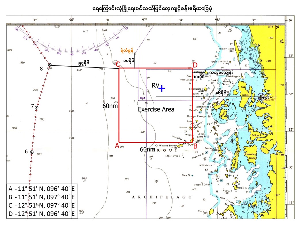 ၂။ သို့ဖြစ်ပါ၍  လေ့ကျင့်ခန်းဆောင်ရွက်စဉ်ကာလအတွင်း ဘေးအန္တရာယ်ကင်းရှင်းစေရေးအတွက် အဆိုပါဧရိယာမှ ၅ မိုင်ပတ်လည်အား သင်္ဘောကြီး/ငယ်များ၊  ကုန်တင်/ စက်လှေများ၊ ငါးဖမ်းသင်္ဘောများ၊ စက်တပ်သမ္ဗာန်များ ဖြတ်သန်းသွားလာခြင်း၊ ကျောက်ချရပ်နားခြင်း၊ ငါးဖမ်းခြင်း၊ ငါးဖမ်းကိရိယာများချထားခြင်း  မရှိစေရန်နှင့် လေယာဉ်၊ ရဟတ်ယာဉ်များအမြင့်ပေ ၁၅၀၀၀ (တစ်သောင်းငါးထောင်) အောက် ဖြတ်ကျော်ပျံသန်းခြင်း မပြုကြရန် အသိပေးကြေညာအပ်ပါသည်။