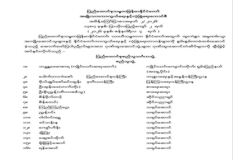 ပြည်ထောင်စုသမ္မတမြန်မာနိုင်ငံတော် ပြည်ထောင်စုရွေးကောက်ပွဲကော်မရှင် ကြေညာချက်အမှတ် (၉/၂၀၂၆) ၁၃၈၇ ခုနှစ်၊ ပြာသိုလပြည့်ကျော် ၄ ရက် (၂၀၂၆ ခုနှစ်၊ ဇန်နဝါရီလ ၆ ရက်) တိုင်းဒေသကြီးလွှတ်တော် သို့မဟုတ် ပြည်နယ်လွှတ်တော်ကိုယ်စားလှယ်အဖြစ် ရွေးကောက်တင်မြှောက်ခံရသူများအမည်စာရင်းကြေညာခြင်း