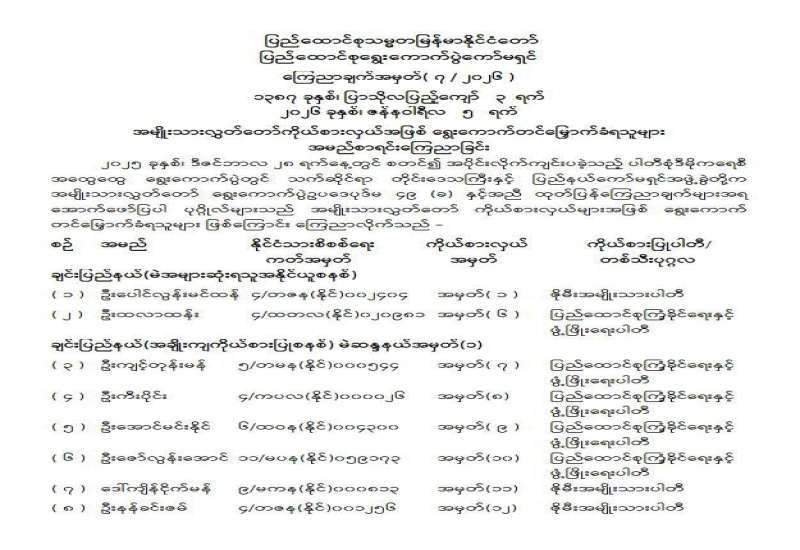 တိုင်းဒေသကြီးလွှတ်တော် သို့မဟုတ် ပြည်နယ်လွှတ်တော်ကိုယ်စားလှယ်အဖြစ် ရွေးကောက်တင်မြှောက်ခံရသူများအမည်စာရင်း ကြေညာခြင်း