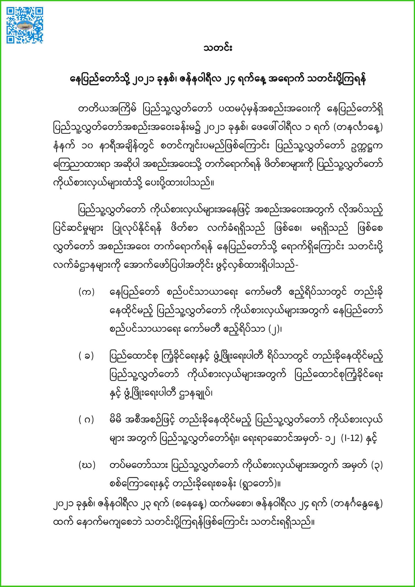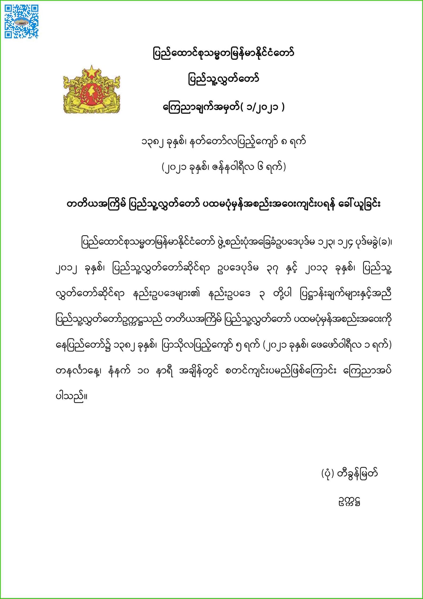 တတိယအကြိမ် ပြည်သူ့လွှတ်တော် ပထမပုံမှန်အစည်းအဝေးကျင်းပရန် ခေါ်ယူခြင်း 01/06/2021 တတိယအကြိမ် ပြည်သူ့လွှတ်တော် ပထမပုံမှန်အစည်းအဝေးကျင်းပရန် ခေါ်ယူခြင်း ၂၀၂၁ ခုနှစ်၊ ဇန်နဝါရီလ ၆ ရက်
