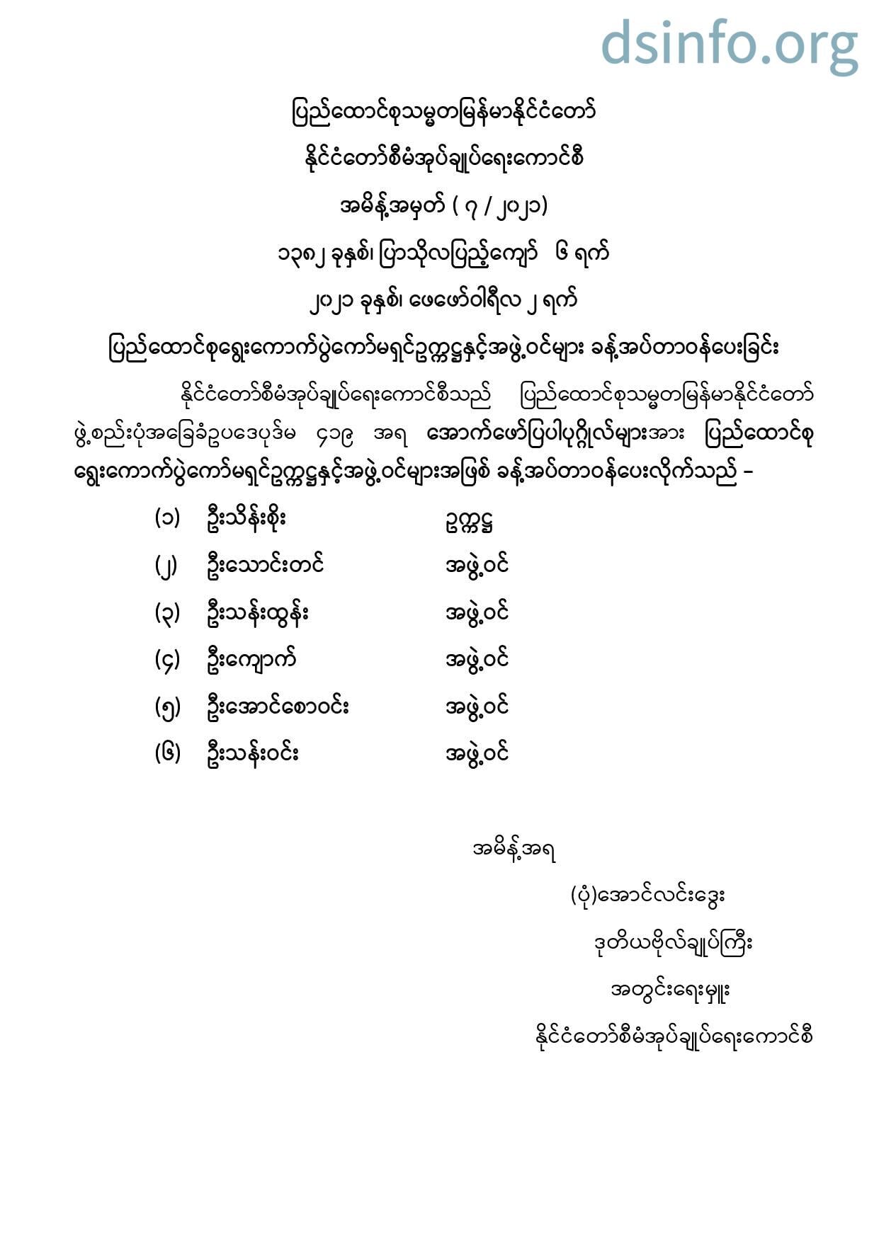 ပြည်ထောင်စုရွေးကောက်ပွဲကော်မရှင်ဥက္ကဋ္ဌနှင့်အဖွဲ့ဝင်များ ခန့်အပ်တာဝန်ပေးခြင်း