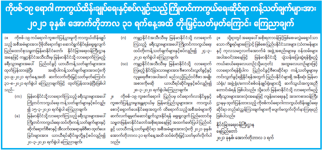 ကိုဗစ်-၁၉ရောဂါကာကွယ်ထိန်းချုပ်ရေးနှင့် စပ်လျဉ်းသည့် ကြိုတင်ကာကွယ်ရေးဆိုင်ရာ ကန့်သတ်ချက်များအား ၂၀၂၁ ခုနှစ်၊ အောက်တိုဘာလ ၃၁ ရက်နေ့အထိ တိုးမြှင့်သတ်မှတ်ကြောင်း ကြေညာချက် 10/02/2021