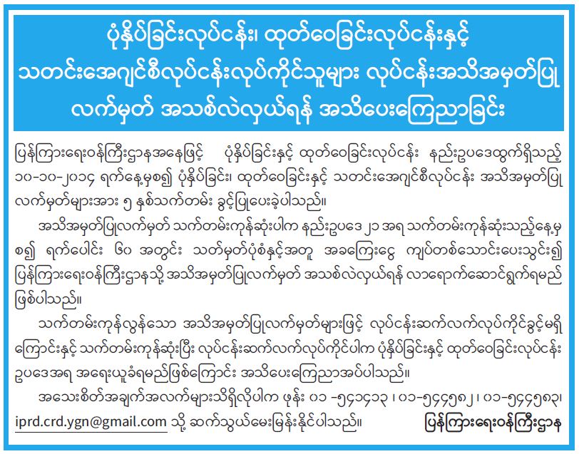 ပုံနှိပ်ခြင်းလုပ်ငန်း၊ ထုတ်ဝေခြင်းလုပ်ငန်းနှင့်၊ သတင်းအေဂျင်စီလုပ်ငန်းလုပ်ကိုင်သူများ လုပ်ငန်း အသိအမှတ်ပြုလက်မှတ် အသစ်လဲလှယ်ရန် အသိပေးကြေညာခြင်း