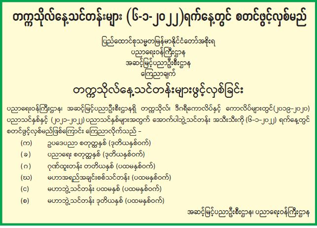 တက္ကသိုလ်နေ့သင်တန်းများ (၆-၁-၂၀၂၂) ရက်နေ့တွင် စတင်ဖွင့်လှစ်မည်