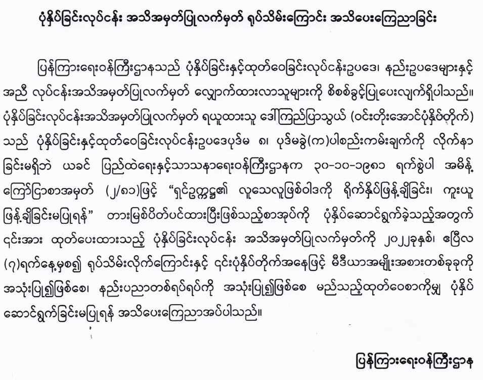 ပုံနှိပ်ခြင်းလုပ်ငန်း အသိအမှတ်ပြုလက်မှတ် ရုပ်သိမ်းကြောင်း အသိပေးကြေညာခြင်း