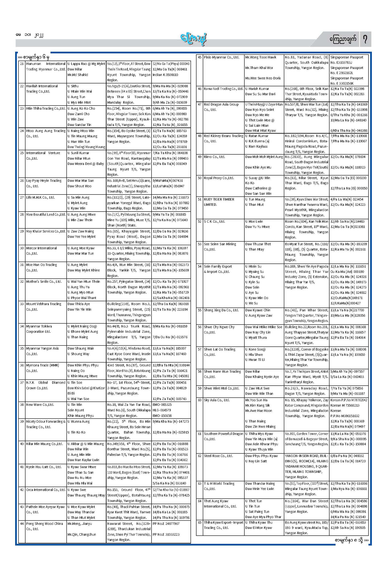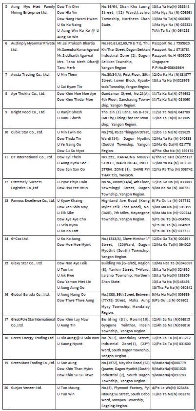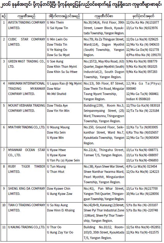 ၅။ အဆိုပါကုမ္ပဏီ(၁၅၈)ခု (ပူးတွဲစာရင်း) အား နိုင်ငံခြားသုံးငွေစီမံခန့်ခွဲမှုဥပဒေ ပုဒ်မ ၄၂-က အရ အရေးယူဆောင်ရွက်လျက်ရှိပြီး ကုမ္ပဏီများနှင့် ပူးတွဲဖော်ပြထားသည့် ကုမ္ပဏီများ၏ ဒါရိုက်တာအဖွဲ့ဝင်များအား အမည်မည်းစာရင်းထည့်သွင်းကြောင်းနှင့် ကျန်ရှိနေသေးသည့် ပို့ကုန်ရငွေဝင်ရောက်ရန် ကျန်ကုမ္ပဏီများအားလည်း အရေးယူဆောင်ရွက်ရန် ဆက်လက်စိစစ်လျက်ရှိကြောင်း ကြေညာပါသည်။
