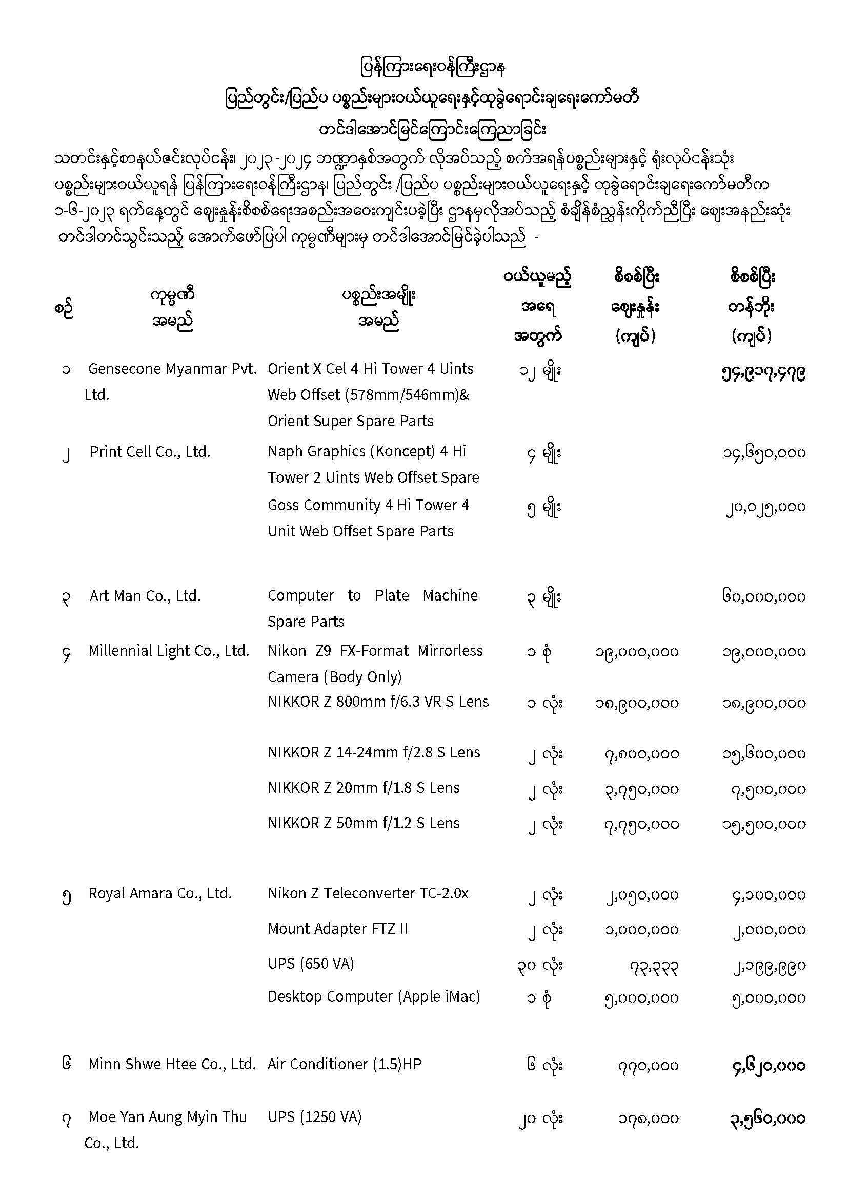 ပြန်ကြားရေးဝန်ကြီးဌာန ပြည်တွင်း/ပြည်ပ ပစ္စည်းများဝယ်ယူရေးနှင့်ထုခွဲရောင်းချရေးကော်မတီ တင်ဒါအောင်မြင်ကြောင်း ကြေညာခြင်း