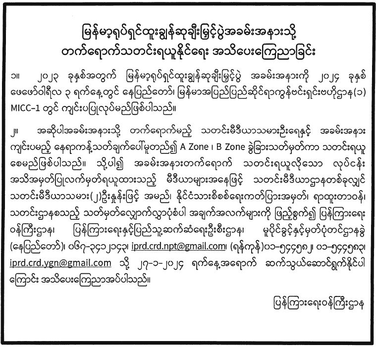၂။ အဆိုပါအခမ်းအနားသို့ တက်ရောက်မည့် သတင်းမီဒီယာသမားဉီးရေနှင့် အခမ်းအနား ကျင်းပမည့် နေရာကန့်သတ်ချက်ပေါ်မူတည်၍ A Zone ၊ B Zone ခွဲခြားသတ်မှတ်ကာ သတင်းရယူ စေမည်ဖြစ်ပါသည်။ သို့ပါ၍ အခမ်းအနားတက်ရောက် သတင်းရယူလိုသော လုပ်ငန်း အသိအမှတ်ပြုလက်မှတ်ရယူထားသည့် မီဒီယာများအနေဖြင့် သတင်းမီဒီယာဌာနတစ်ခုလျှင် သတင်းမီဒီယာသမား(၂)ဦးနှုန်းဖြင့် အမည်၊ နိုင်ငံသားစိစစ်ရေးကတ်ပြားအမှတ်၊ ရာထူးတာဝန်၊ သတင်းဌာနစသည့် သတ်မှတ်လျှောက်လွှာပုံစံပါ အချက်အလက်များကို ဖြည့်စွက်၍ ပြန်ကြားရေး ဝန်ကြီးဌာန၊ ပြန်ကြားရေးနှင့်ပြည်သူ့ဆက်ဆံရေးဦးစီးဌာန၊ မူပိုင်ခွင့်နှင့်မှတ်ပုံတင်ဌာနခွဲ (နေပြည်တော်)၊ ၀၆၇-၃၄၁၂၁၄၃၊ [email protected]၊ (ရန်ကုန်)၀၁-၅၄၄၅၈၂၊ ၀၁-၅၄၄၅၈၃၊ [email protected] သို့ ၂၇-၁-၂၀၂၄ ရက်နေ့အရောက် ဆက်သွယ်ဆောင်ရွက်နိုင်ပါ ကြောင်း အသိပေးကြေညာအပ်ပါသည်။