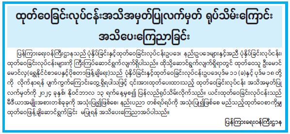 ပြန်ကြားရေးဝန်ကြီးဌာနသည် ပုံနှိပ်ခြင်းနှင့်ထုတ်ဝေခြင်းလုပ်ငန်းဥပဒေ၊ နည်းဥပဒေများနှင့်အညီပုံနှိပ်ခြင်းလုပ်ငန်း၊ ထုတ်ဝေခြင်းလုပ်ငန်းများကို ကြီးကြပ်ဆောင်ရွက်လျက်ရှိပါသည်။ ထိုသို့ဆောင်ရွက်လျက်ရှိရာတွင် ထုတ်ဝေသူ ဦးမောင်မောင်လှ (ရွှေနိုင်ငံစာပေနှင့်ပိုစတာဖြန့်ချိရေး) သည် ပုံနှိပ်ခြင်းနှင့်ထုတ်ဝေခြင်းလုပ်ငန်းဥပဒေပုဒ်မ ၁၁ (ခ)နှင့် ပုဒ်မ ၁၈ တို့ကိုလိုက်နာရန် ပျက်ကွက်ကြောင်းတွေ့ရှိရပါသဖြင့် ၎င်းအားထုတ်ပေးထားသည့် ထုတ်ဝေခြင်းလုပ်ငန်း အသိအမှတ်ပြုလက်မှတ်ကို ၂၀၂၄ ခုနှစ်၊ နိုဝင်ဘာလ ၁၃ ရက်နေ့မှစ၍ ပြန်လည်ရုပ်သိမ်းလိုက်သည်။ ယင်းထုတ်ဝေခြင်းလုပ်ငန်းသည် မီဒီယာအမျိုးအစားတစ်ခုခုကို အသုံးပြု၍ဖြစ်စေ၊ နည်းပညာတစ်ရပ်ရပ်ကိုအသုံးပြု၍ဖြစ်စေ မည်သည့်ထုတ်ဝေစာကိုမျှ ထုတ်ဝေဖြန့်ချိဆောင်ရွက်ခြင်းမပြုရန် အသိပေးကြေညာအပ်ပါသည်။