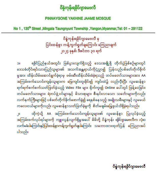 ယခုကဲ့သို့ AA အကြမ်းဖက်သောင်းကျန်းသူအဖွဲ့၏ စစ်ရာဇဝတ်မှု(War Crime) မြောက်သည့် လူမဆန်စွာရက်စက် ယုတ်မာရိုင်းစိုင်းသော အကြမ်းဖက်လုပ်ရပ်များအပေါ် မည်သို့မျှ လက်ခံနိုင်ဖွယ်ရာမရှိသည့်အတွက် ဗုဒ္ဓဘာသာကလျာဏယုဝအသင်း YMBA(ဗဟို)၊ ဘာသာပေါင်းစုံချစ်ကြည်ညီညွတ်ရေးအဖွဲ့(ဗဟို)၊ မြန်မာနိုင်ငံဧဝံဂေလိ ခရစ်ယာန်မဟာမိတ်အဖွဲ့ချုပ်၊ ပြည်ထောင်စုမြန်မာနိုင်ငံမက်သဒစ်အသင်းတော် (အောက်မြန်မာပြည်)၊ ယုံကြည်ခြင်းဧဝံဂေလိအသင်းတော်(ပဲခူး)၊ လွတ်မြောက်ခြင်းအသင်းတော်(ရန်ကုန်)၊ မြန်မာနိုင်ငံလုံးဆိုင်ရာဟိန္ဒူဘာသာရေးဗဟိုအဖွဲ့ချုပ်၊ မြန်မာနိုင်ငံလုံးဆိုင်ရာတမီလ်ဟိန္ဒူဖောင်ဒေးရှင်း(ဗဟို)၊ သနန္တဓမ္မပါလက(ဟိန္ဒူ)အဖွဲ့ချုပ်၊ မြန်မာနိုင်ငံလုံးဆိုင်ရာအစ္စလာမ်ဘာသာရေးအဖွဲ့ကြီး၊ မြန်မာနိုင်ငံသတင်းမီဒီယာကောင်စီ၊ မြန်မာနိုင်ငံစာရေးဆရာအသင်း၊ မြန်မာနိုင်ငံရုပ်ရှင်အစည်းအရုံး၊ မြန်မာနိုင်ငံဂီတအစည်းအရုံး(ဗဟို)၊ မြန်မာနိုင်ငံပန်းချီပန်းပုအစည်းအရုံး(ဗဟို)၊ မြန်မာနိုင်ငံသဘင်အစည်းအရုံး(ဗဟို)၊ မြန်မာနိုင်ငံဟာသပညာရှင်များအစည်းအရုံး၊ မြန်မာနိုင်ငံအားကစားမီဒီယာများအဖွဲ့ချုပ်နှင့် ပိန္နဲကုန်းရခိုင်ဂျာမေဗလီတို့မှ ပြင်းထန်စွာ ကန့်ကွက်ရှုတ်ချပါကြောင်း သဘောထားများ အသီးသီးထုတ်ပြန်ခဲ့ကြကြောင်း သတင်းရရှိသည်။