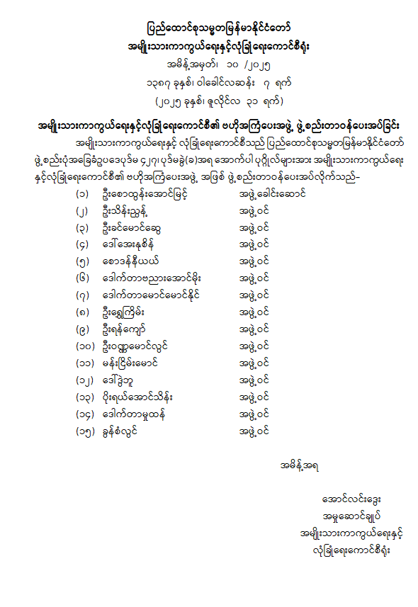 အမျိုးသားကာကွယ်ရေးနှင့် လုံခြုံရေးကောင်စီ၏ ဗဟိုအကြံပေးအဖွဲ့ ဖွဲ့စည်းတာဝန်ပေးအပ်ခြင်း