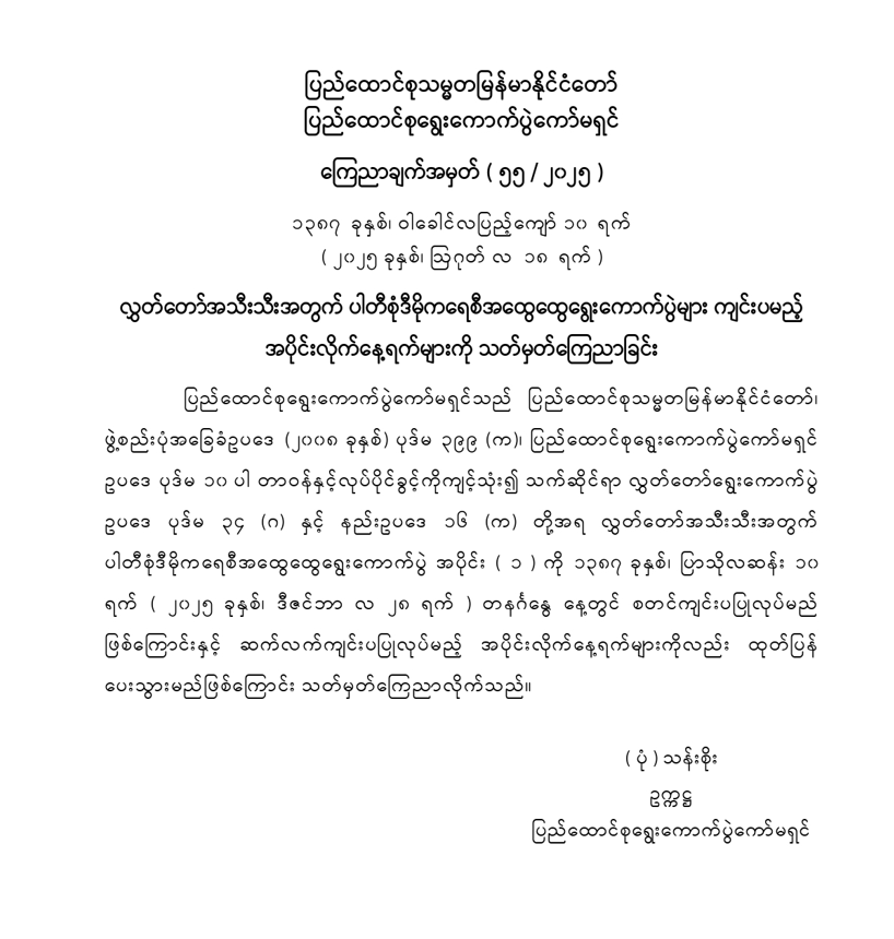 လွှတ်တော်အသီးသီးအတွက် ပါတီစုံဒီမိုကရေစီအထွေထွေရွေးကောက်ပွဲများ ကျင်းပမည့် အပိုင်းလိုက်နေ့ရက်များကို သတ်မှတ်ကြေညာခြင်း 08/18/2025