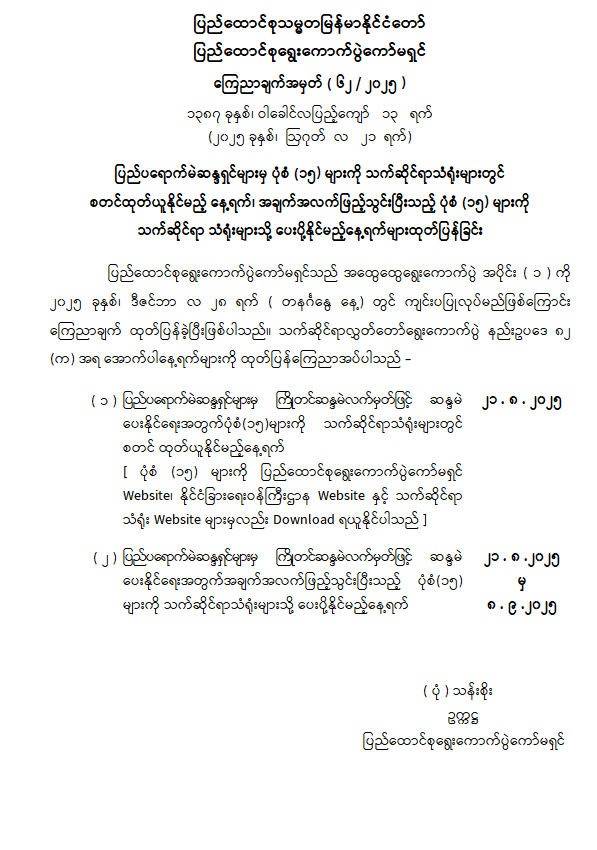 ပြည်ပရောက်မဲဆန္ဒရှင်များမှ ပုံစံ (၁၅) များကို သက်ဆိုင်ရာသံရုံးများတွင် စတင်ထုတ်ယူနိုင်မည့် နေ့ရက်၊ အချက်အလက်ဖြည့်သွင်းပြီးသည့် ပုံစံ (၁၅) များကို သက်ဆိုင်ရာ သံရုံးများသို့ ပေးပို့နိုင်မည့်နေ့ရက်များထုတ်ပြန်ခြင်း 08/21/2025