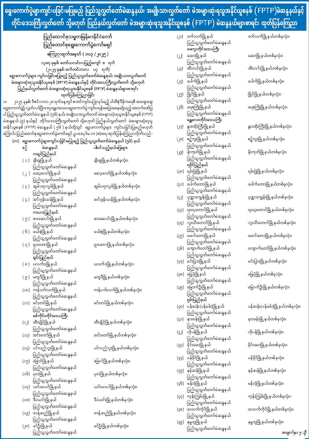 ရွေးကောက်ပွဲများကျင်းပခြင်းမပြုမည့် ပြည်သူ့လွှတ်တော်မဲဆန္ဒနယ်၊ အမျိုးသားလွှတ်တော် မဲအများဆုံးရသူအနိုင်ယူစနစ် (FPTP) မဲဆန္ဒနယ်နှင့် တိုင်းဒေသကြီးလွှတ်တော် သို့မဟုတ် ပြည်နယ်လွှတ်တော် မဲအများဆုံးရသူအနိုင်ယူစနစ် (FPTP) မဲဆန္ဒနယ်များစာရင်း ထုတ်ပြန်ကြေညာ