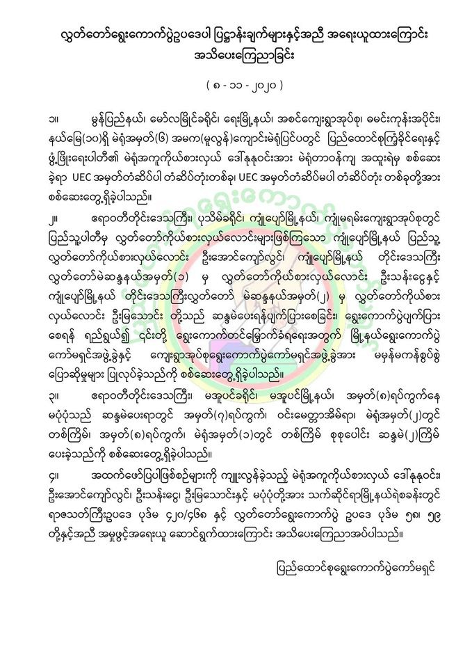 လွှတ်တော်ရွေးကောက်ပွဲဥပဒေပါ ပြဋ္ဌာန်းချက်များနှင့်အညီ အရေးယူထားကြောင်း အသိပေးကြေညာခြင်း