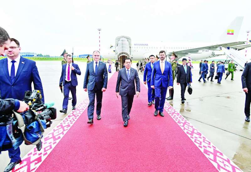 EAEU ၏အလှည့်ကျဥက္ကဋ္ဌဖြစ်သည့် ဘယ်လာရုစ်သမ္မတနိုင်ငံသမ္မတ H.E. Mr. Alexander Grigoryevich Lukashenko ၏ ဖိတ်ကြားချက်အရ မင့်စ်မြို့၌ ကျင်းပပြုလုပ်မည့် စတုတ္ထအကြိမ် ဥရောပ-အာရှစီးပွားရေးဖိုရမ်(EEF 2025)သို့ တက်ရောက်ရန်အတွက် နိုင်ငံတော်စီမံအုပ်ချုပ်ရေးကောင်စီဥက္ကဋ္ဌ နိုင်ငံတော်ဝန်ကြီးချုပ် ဗိုလ်ချုပ်မှူးကြီးမင်းအောင်လှိုင် ဦးဆောင်သည့် မြန်မာအဆင့်မြင့်ကိုယ်စားလှယ်အဖွဲ့သည် ယနေ့နံနက်ပိုင်းတွင် အထူးလေယာဉ်ဖြင့် နေပြည်တော် တပ်မတော်လေဆိပ်မှ ထွက်ခွာသည်။