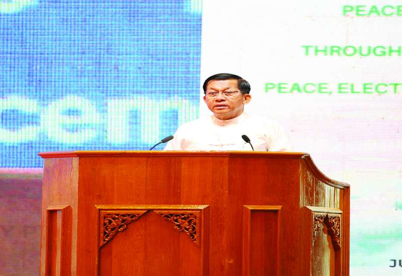 ငြိမ်းချမ်းရေးဖိုရမ် - Peace Forum 2025 " ငြိမ်းချမ်းရေး၊ ရွေးကောက်ပွဲနှင့် ဖက်ဒရယ်စနစ်တို့ ပေါင်းစည်းခြင်းမှ အေးချမ်းသာယာဝပြောသည့် နိုင်ငံတော်သစ်ဆီသို့” သုံးသပ်ဆွေးနွေးပွဲဖွင့်ပွဲကို ယနေ့နံနက်ပိုင်းတွင် နေပြည်တော်၊ မင်္ဂလာသီရိဟိုတယ်၌ကျင်းပရာ နိုင်ငံတော်စီမံအုပ်ချုပ်ရေးကောင်စီဥက္ကဋ္ဌ နိုင်ငံတော်ဝန်ကြီးချုပ် အမျိုးသားစည်းလုံးညီညွတ်ရေးနှင့် ငြိမ်းချမ်းရေးဖော်ဆောင်မှုဗဟိုကော်မတီဥက္ကဋ္ဌ ဗိုလ်ချုပ်မှူးကြီးမင်းအောင်လှိုင် တက်ရောက်အမှာစကားပြောကြားသည်။