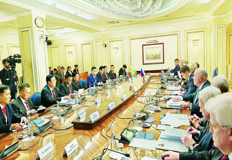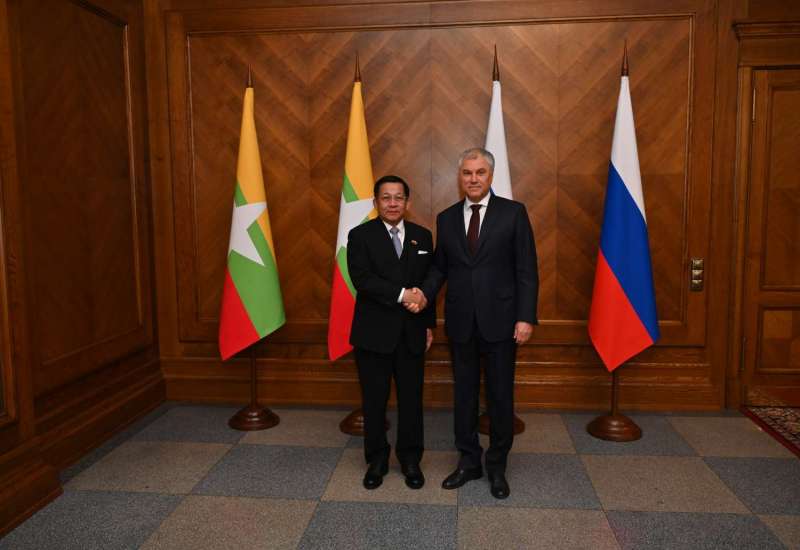 ရုရှားဖက်ဒရေးရှင်းနိုင်ငံ၊ မော်စကိုမြို့သို့ တရားဝင်ချစ်ကြည်ရေးခရီးရောက်ရှိနေသည့် နိုင်ငံတော်စီမံအုပ်ချုပ်ရေးကောင်စီဥက္ကဋ္ဌ၊ နိုင်ငံတော်ဝန်ကြီးချုပ် ဗိုလ်ချုပ်မှူးကြီး မင်းအောင်လှိုင်သည် ယနေ့နံနက်ပိုင်းတွင် ဒူးမားလွှတ်တော်ဥက္ကဋ္ဌ H.E. Mr. Vyacheslav Volodin နှင့် ဒူးမားလွှတ်တော်အဆောက်အဦ အစည်းအဝေးခန်းမ၌ တွေ့ဆုံဆွေးနွေးသည်။