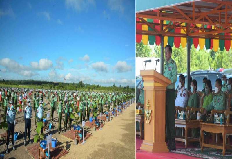 ၂၀၂၂ ခုနှစ်၊ ကာကွယ်ရေးဦးစီးချုပ်ရုံး (ကြည်း၊ ရေ၊ လေ) မိသားစုများ၏ ဒုတိယအကြိမ် မိုးရာသီသစ်ပင်စိုက်ပျိုးပွဲ အခမ်းအနားကို နေပြည်တော်၊ ဇေယျာသီရိမြို့နယ်၊ ရေဆင်းဆည်အနီး၌ ယနေ့နံနက်ပိုင်းတွင် ကျင်းပပြုလုပ်ရာ နိုင်ငံတော်စီမံအုပ်ချုပ်ရေးကောင်စီဥက္ကဋ္ဌ တပ်မတော်ကာကွယ်ရေးဦးစီးချုပ် ဗိုလ်ချုပ်မှူးကြီး မင်းအောင်လှိုင် တက်ရောက်၍ ရတနာတန်းဝင် ကျွန်းပင်ကို ဦးဆောင်စိုက်ပျိုးပေးသည်။