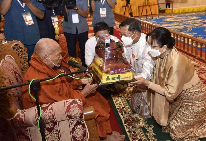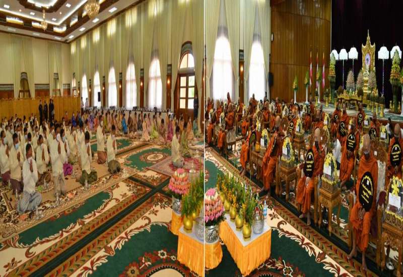 ၂၀၂၂ ခုနှစ်၊ ကာကွယ်ရေးဦးစီးချုပ်ရုံး (ကြည်း၊ ရေ၊ လေ) မိသားစုများ ဝါဆိုသင်္ကန်း ဆက်ကပ်လှူဒါန်းပွဲ မဟာမင်္ဂလာအခမ်းအနားကို ယနေ့နံနက်ပိုင်းတွင် ကာကွယ်ရေးဦးစီးချုပ်ရုံး (ကြည်း)၊ အနော်ရထာခန်းမ၌ ကျင်းပပြုလုပ်ရာ နိုင်ငံတော်စီမံအုပ်ချုပ်ရေးကောင်စီဥက္ကဋ္ဌ တပ်မတော်ကာကွယ်ရေးဦးစီးချုပ် ဗိုလ်ချုပ်မှူးကြီး မင်းအောင်လှိုင်နှင့်ဇနီး ဒေါ်ကြူကြူလှ တို့ တက်ရောက်ကြည်ညို၍ ဝါဆိုသင်္ကန်း၊ လှူဖွယ်ပစ္စည်းများနှင့် နေ့ဆွမ်းတို့ကို ဆက်ကပ်လှူဒါန်းသည်။
