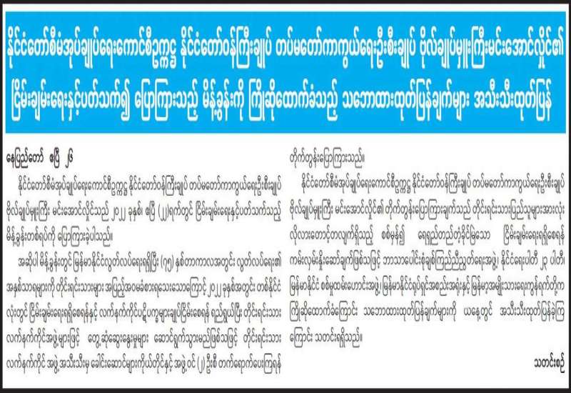 နိုင်ငံတော်စီမံအုပ်ချုပ်ရေးကောင်စီဥက္ကဋ္ဌ နိုင်ငံတော်ဝန်ကြီးချုပ် တပ်မတော်ကာကွယ်ရေးဦးစီးချုပ် ဗိုလ်ချုပ်မှူးကြီးမင်းအောင်လှိုင်၏ ငြိမ်းချမ်းရေးနှင့်ပတ်သက်၍ ပြောကြားသည့်မိန့်ခွန်းကို ကြိုဆိုထောက်ခံသည့် သဘောထားထုတ်ပြန်ချက်များ အသီးသီးထုတ်ပြန်