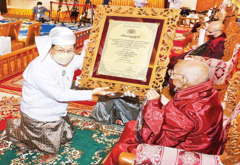၂၀၂၂ ခုနှစ် သာသနာတော်ဆိုင်ရာ ဘွဲ့တံဆိပ်တော်များ ဆက်ကပ်ပူဇော်ပွဲ မဟာမင်္ဂလာအခမ်းအနားကို ယနေ့မွန်းလွဲပိုင်းတွင် နေပြည်တော် ဥပ္ပါတသန္တိစေတီတော် ပရိဝုဏ်အတွင်းရှိ သာသနာ့ မဟာဗိမာန်တော်ကြီး၌ကျင်းပရာ နိုင်ငံတော်စီမံအုပ်ချုပ်ရေးကောင်စီဥက္ကဋ္ဌ နိုင်ငံတော်ဝန်ကြီးချုပ် ဗိုလ်ချုပ်မှူးကြီး မင်းအောင်လှိုင်နှင့်ဇနီး ဒေါ်ကြူကြူလှတို့ တက်ရောက်ကြည်ညို၍ သာသနာတော် ဆိုင်ရာဘွဲ့တံဆိပ်တော်များ ဆက်ကပ်ပူဇော်ကြသည်။