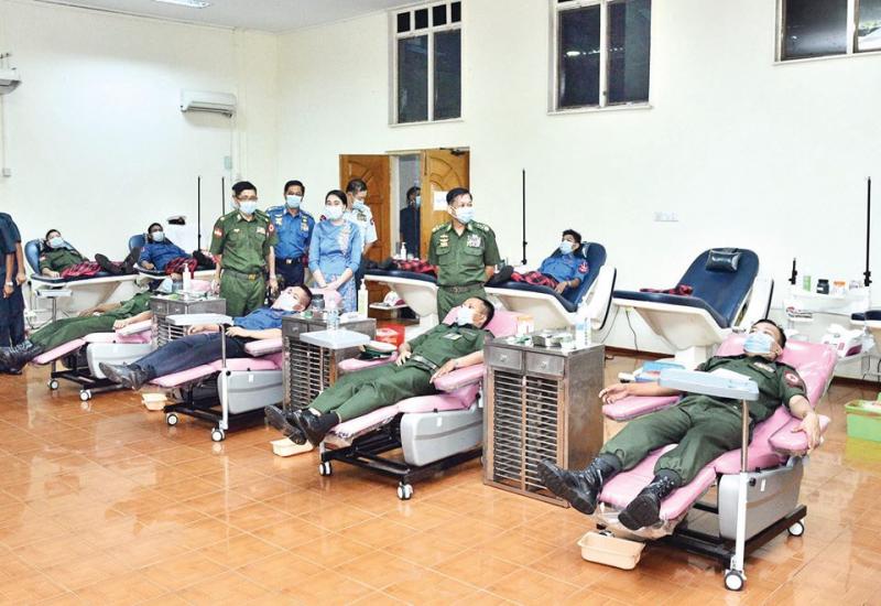 ရန်ကုန်တိုင်းစစ်ဌာနချုပ်နယ်မြေအတွင်းရှိ တပ်မတော် (ကြည်း၊ ရေ၊ လေ) မှ အရာရှိ၊ စစ်သည်များက ရန်ကုန်တိုင်းဒေသကြီး လသာမြို့နယ်ရှိ ကျန်းမာရေးနှင့် အားကစားဝန်ကြီးဌာန အမျိုးသားသွေးဌာန (ရန်ကုန်) ၌ ယနေ့နံနက်ပိုင်းတွင် စုပေါင်းသွေးလှူဒါန်းကြရာ တပ်မတော်ကာကွယ်ရေးဦးစီးချုပ် ဗိုလ်ချုပ် မှူးကြီး မင်းအောင်လှိုင်နှင့် တပ်မတော်အရာရှိကြီးများက သွားရောက်ကြည့်ရှု အားပေးကြသည်။
