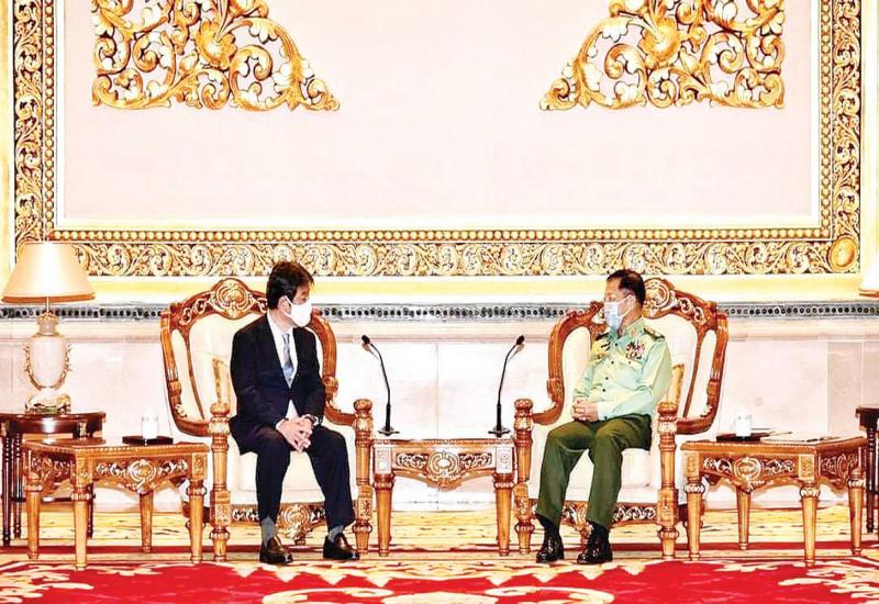 တပ်မတော်ကာကွယ်ရေးဦးစီးချုပ် ဗိုလ်ချုပ်မှူးကြီး မင်းအောင်လှိုင်သည် ဂျပန်နိုင်ငံခြားရေး ဝန်ကြီးဌာန ဝန်ကြီး မစ္စတာ မိုတဲဂိတိုရှိမိစု ဦးဆောင်သော ကိုယ်စားလှယ်အဖွဲ့အား ယနေ့ညနေပိုင်း တွင် နေပြည်တော်ရှိ ဇေယျာသီရိဗိမာန်ဧည့်ခန်းမဆောင်၌ လက်ခံတွေ့ဆုံသည်။