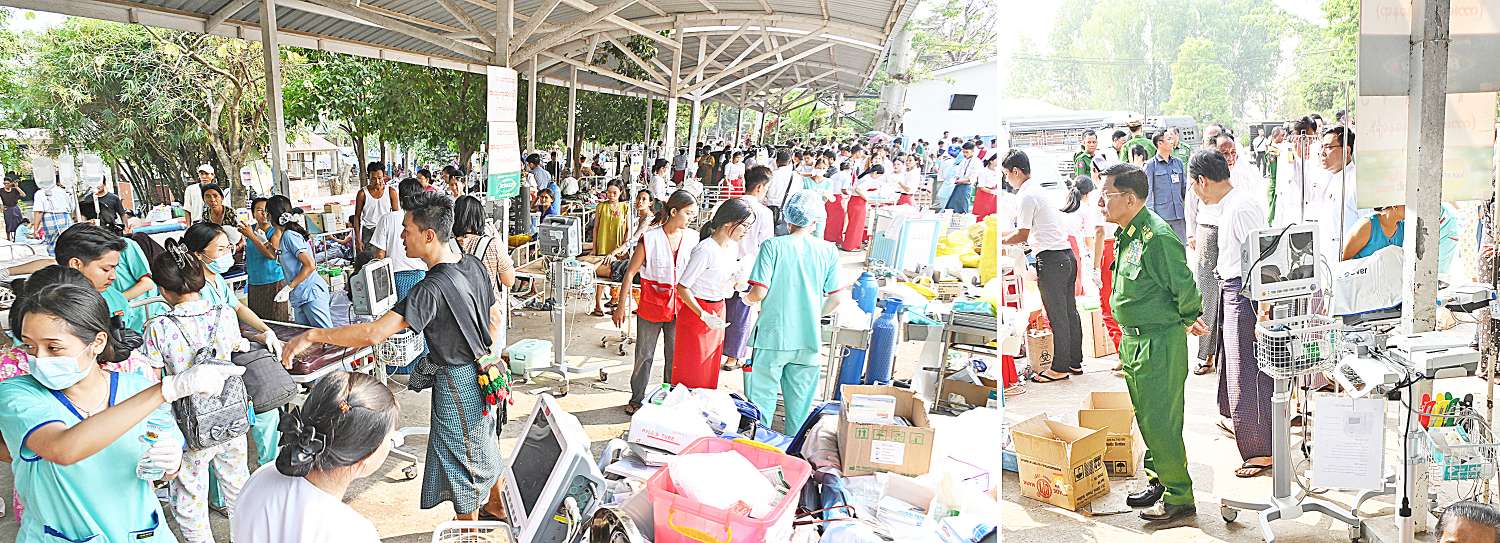 ထို့နောက် နိုင်ငံတော်စီမံအုပ်ချုပ်ရေးကောင်စီဥက္ကဋ္ဌ နိုင်ငံတော်ဝန်ကြီးချုပ်နှင့် အဖွဲ့ဝင်များသည် နေပြည်တော်၊ ပြည်သူ့ဆေးရုံကြီး (ခုတင်-၁၀၀၀) သို့ ရောက်ရှိကြပြီး ငလျင်ဘေးဒဏ်ကြောင့် ထိခိုက်ဒဏ်ရာရရှိခဲ့သူများအား ဆေးဝါးကုသမှုဆောင်ရွက်ပေးနေမှုများကိုကြည့်ရှု၍ အားပေးစကားပြောကြားကာ ထိခိုက်ဒဏ်ရာရရှိသူများအား လိုအပ်သည့်ကျန်းမာရေးစောင့်ရှောက်မှုများကို အမြန်ဆုံးဆောင်ရွက်ပေးသွားနိုင်ရေး ကျန်းမာရေးဝန်ကြီးဌာနနှင့် တပ်မတော်ဆေးဝန်ထမ်းညွှန်ကြားရေးမှူးရုံးတို့ပူးပေါင်း၍ လျင်လျင်မြန်မြန်ဆောင်ရွက်သွားရန်နှင့် အခြားလိုအပ်သည်များကို မှာကြားသည်။