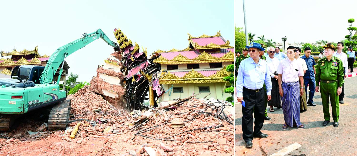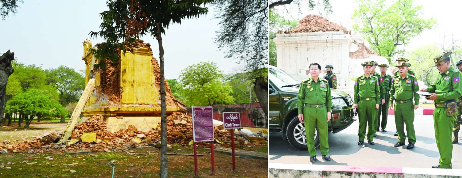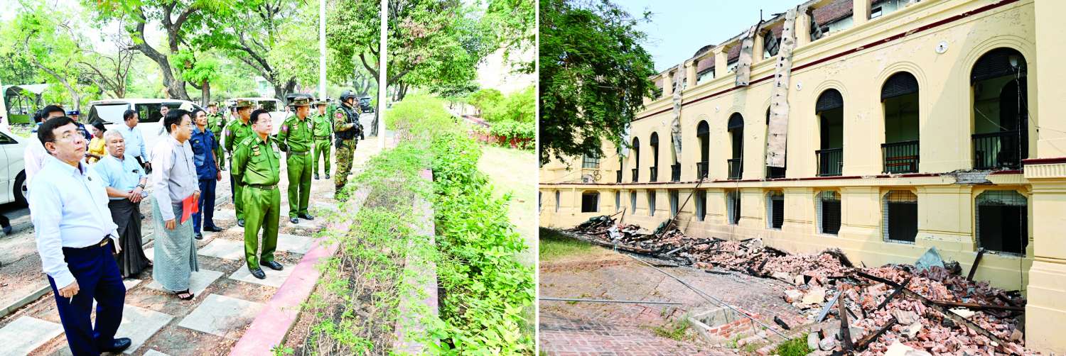 ထို့နောက် နိုင်ငံတော်စီမံအုပ်ချုပ်ရေးကောင်စီဥက္ကဋ္ဌ နိုင်ငံတော်ဝန်ကြီးချုပ်သည် နန်းမြို့ရိုးတစ်လျှောက် ငလျင်ဒဏ်ကြောင့် ပြိုကျပျက်စီးခဲ့ရမှုအခြေအနေများ၊ မန္တလေးမြို့အတွင်း အဆောက်အအုံနှင့် လမ်းများပျက်စီးခဲ့ရမှု၊ မန္တလေးတက္ကသိုလ်ပင်မဆောင် ပြိုကျပျက်စီးမှုနှင့် မီးလောင်ပျက်စီးခဲ့ရမှုအခြေအနေများကို လိုက်လံကြည့်ရှုစစ်ဆေးပြီး တာဝန်ရှိသူများ၏ တင်ပြချက်များအပေါ် ပြိုကျပျက်စီးနေသည့် အဆောက်အအုံများအတွင်း ပိတ်မိနေသူများအား အမြန်ဆုံး ရှာဖွေဖော်ထုတ်နိုင်ရေး ဆောင်ရွက်သွားရန်၊ ပြန်လည်ဆယ်တင်ရေးလုပ်ငန်းများကို ဦးစားပေးအဆင့်အလိုက် ဆက်လက်ဆောင်ရွက်သွားရန်၊ သင်ကြားရေး၊ ကျန်းမာရေး အဆောက်အအုံများအပြင် အဆောက်အအုံသစ်များ ပြန်လည်တည်ဆောက်ရာ၌ မြန်မြန်ဆန်ဆန်နှင့် ခိုင်ခိုင်မာမာဖြစ်စေရေး ဆောင်ရွက်သွားရန်နှင့် အခြားလိုအပ်သည်များကို မှာကြားသည်။