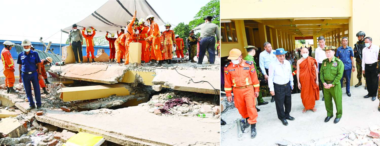 ယင်းနောက် နိုင်ငံတော် စီမံအုပ်ချုပ်ရေးကောင်စီဥက္ကဋ္ဌ နိုင်ငံတော်ဝန်ကြီးချုပ်နှင့် အဖွဲ့ဝင်များသည် မန္တလေးမြို့ ပရိယတ္တိသာသနဟိတအသင်းကြီး တိုးချဲ့ဆောင်သို့ ရောက်ရှိကြပြီး လေးထပ်တိုးချဲ့ဆောင် ငလျင်ဘေးဒဏ်ကြောင့် ပြိုကျပျက်စီးနေမှုနှင့် အပျက်အစီးများအကြား ပိတ်မိနေသည့် စာဖြေသံဃာတော်များအား ရှာဖွေကူညီရေးဆောင်ရွက်နေမှုများကို လိုက်လံကြည့်ရှုကာ ကူညီကယ်ဆယ်ရေးလုပ်ငန်းများ အရှိန်အဟုန်ဖြင့် ဆောင်ရွက်သွားနိုင်ရေး တာဝန် ရှိသူများကို မှာကြားသည်။
