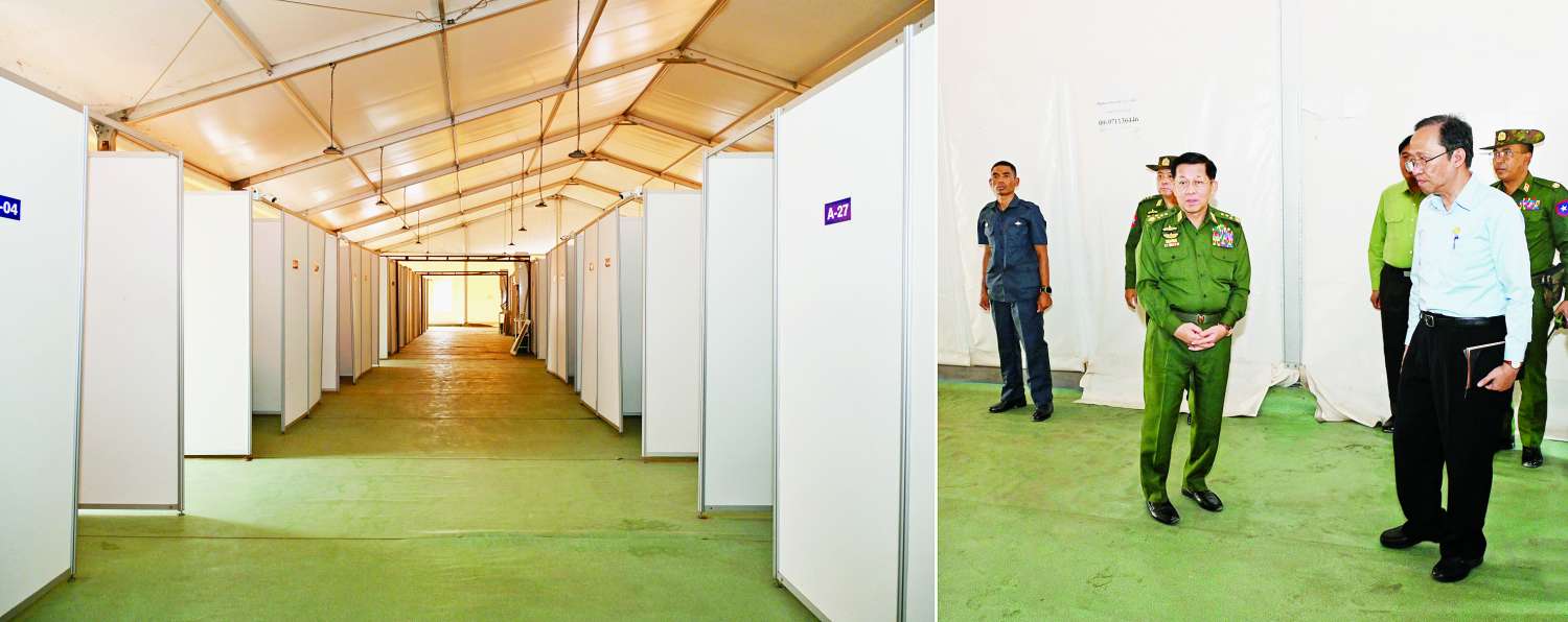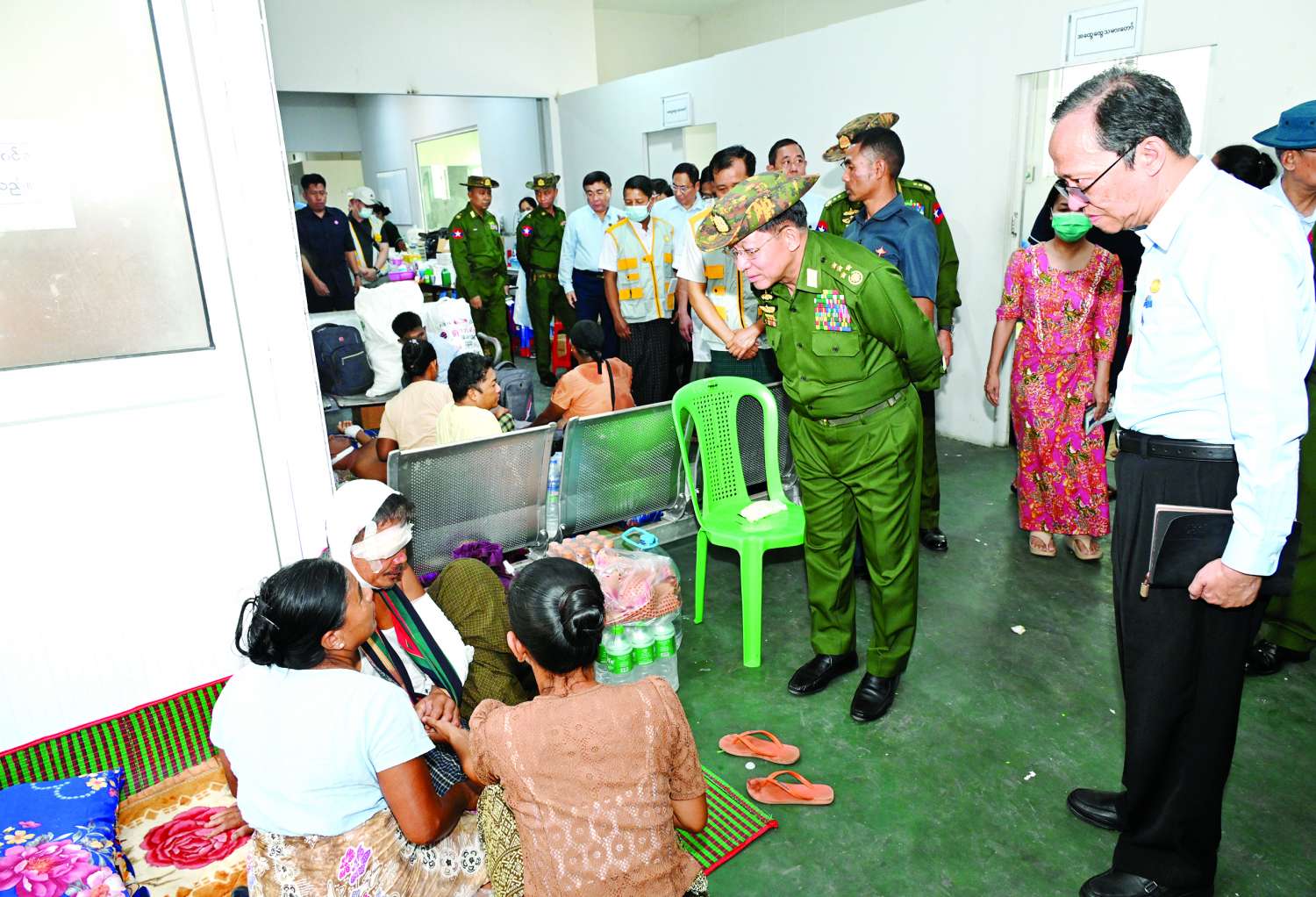 ထို့နောက် နိုင်ငံတော်စီမံအုပ်ချုပ်ရေးကောင်စီဥက္ကဋ္ဌ နိုင်ငံတော်ဝန်ကြီးချုပ်သည် ချမ်းမြသာစည်မြို့နယ်ရှိ လေဆိပ်အဟောင်းနေရာ၌ ငလျင်ဒဏ်ကြောင့် ထိခိုက်ဒဏ်ရာရရှိသူများအား ဆေးကုသ မှု ဆောင်ရွက်ပေးနိုင်ရေးအတွက် ယာယီဆေးရုံနှင့် ကယ်ဆယ်ရေးစခန်းဖွင့်လှစ်ပေးရန် စီစဉ်ဆောင်ရွက်နေမှုအခြေအနေများကို သွားရောက်ကြည့်ရှုစစ်ဆေးပြီး တာဝန်ရှိသူများကို လိုအပ်သည် များ လမ်းညွှန်မှာကြားခဲ့သည်။