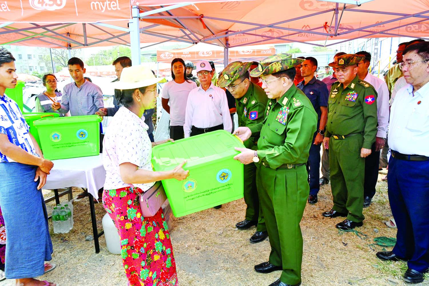 ထို့နောက် နိုင်ငံတော်စီမံအုပ်ချုပ်ရေးကောင်စီဥက္ကဋ္ဌ နိုင်ငံတော်ဝန်ကြီးချုပ်နှင့် အဖွဲ့ဝင်များသည် ချမ်းအေးသာစံမြို့နယ် ၇၃ x ၃၀ လမ်းထောင့်ရှိ ယာယီနေထိုင်ရေး စခန်းသို့ရောက်ရှိကြပြီး တာဝန်ရှိသူများ၏ တင်ပြချက်များအပေါ် လိုအပ်သည်များ မှာကြားသည်။ ယင်းနောက် ငလျင်ဘေးဒဏ်သင့် ပြည်သူများအတွက် လူမှုဝန်ထမ်း၊ ကယ်ဆယ်ရေးနှင့်ပြန်လည်နေရာချထားရေးဝန်ကြီးဌာန ဘေးအန္တရာယ်ဆိုင်ရာစီမံခန့်ခွဲမှုဦးစီးဌာနက ထောက်ပံ့လှူဒါန်းသည့် ကယ်ဆယ်ရေးပစ္စည်း ၁၆ မျိုးပါ ပုံးများပေးအပ်ကာ ရင်းရင်းနှီးနှီး အားပေးစကား ပြောကြားသည်။