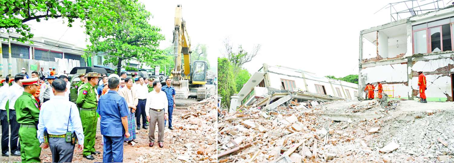 ဦးစွာ နိုင်ငံတော်စီမံအုပ်ချုပ်ရေးကောင်စီဥက္ကဋ္ဌ နိုင်ငံတော်ဝန်ကြီးချုပ်နှင့် အဖွဲ့ဝင်များသည် ငလျင်ဘေးဒဏ်ကြောင့် ထိခိုက်ပျက်စီးခဲ့ရသည့် မြတ်ကိုယ်ပိုင်အထက်တန်းကျောင်းသို့ ရောက်ရှိကြပြီး အပျက်အစီးများဖယ်ရှားရှင်းလင်းခြင်းလုပ်ငန်းများ ဆောင်ရွက်ပေးနေမှုများကို ကြည့်ရှုကာ ကူညီကယ်ဆယ်ရေးအဖွဲ့များနှင့် တာဝန်ရှိသူများ၏ တင်ပြချက်များအပေါ် လိုအပ်သည်များ လမ်းညွှန်မှာကြားသည်။ ယင်းနောက် နိုင်ငံတော်စီမံအုပ်ချုပ်ရေးကောင်စီဥက္ကဋ္ဌ နိုင်ငံတော်ဝန်ကြီးချုပ်နှင့် အဖွဲ့ဝင်များသည် အမှတ်(၁) အခြေခံပညာအထက်တန်းကျောင်းသို့ ရောက်ရှိကြပြီး ငလျင်ဘေးဒဏ်ကြောင့် စာသင်ဆောင်များ ထိခိုက်ပျက်စီးခဲ့ရမှု အခြေအနေများကို ကြည့်ရှုစစ်ဆေးကာ တာဝန်ရှိသူများ၏ တင်ပြချက်များအပေါ် ထိခိုက်ပျက်စီးခဲ့မှုများအား စနစ်တကျစိစစ်၍ ပြန်လည်ပြုပြင်နိုင်သည်များကို အဆင့်အလိုက်ပြုပြင်သွားရန်၊ ပြုပြင်၍မရသည့် အန္တရာယ်ရှိကျောင်းဆောင်များကို စနစ်တကျဖြိုချသွားရန်နှင့် ဆယ်တင်၍ရနိုင်သည့်ပစ္စည်းများကိုလည်း စနစ်တကျ ပြန်လည်ဆယ်တင်အသုံးပြုသွားရန်၊ ပြန်လည်ပြုပြင်၍ရနိုင်သေးသည့် ကျောင်းဆောင်အား ကျောင်းဖွင့်ချိန်မတိုင်မီ စနစ်တကျပြန်လည်ပြုပြင်ပြီးစီးနိုင်ရေး ကြပ်မတ်ဆောင်ရွက်သွားရန်နှင့် ခိုင်ခံ့မှုရှိစေရေး အလေးထားဆောင်ရွက်သွားရန်နှင့် အခြားလိုအပ်သည်များကို မှာကြားသည်။
