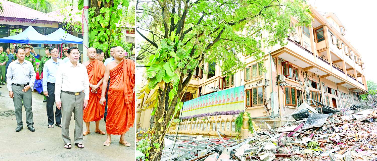 ယင်းနောက် နိုင်ငံတော်စီမံအုပ်ချုပ်ရေးကောင်စီဥက္ကဋ္ဌ နိုင်ငံတော်ဝန်ကြီးချုပ်နှင့် အဖွဲ့ဝင်များသည် လေးကျွန်းမြေအုဌ်ကျောင်း၌ အဆောက်အအုံပျက်စီးနေမှုအား ရှင်းလင်းဖယ်ရှားခြင်း ဆောင်ရွက်နေမှု၊ သကျဓီတာသီလရှင်စာသင်တိုက် အဆောက်အအုံပျက်စီးနေမှုအား ရှင်းလင်းဖယ်ရှားခြင်းဆောင်ရွက်နေမှု၊ ဆွမ်းဦးပုညရှင် စေတီတော်တွင် အဆောက်အအုံပျက်စီးနေမှုအား ရှင်းလင်းဖယ်ရှားခြင်းဆောင်ရွက်နေမှု၊ ရတနာသိင်္ဂီ သီလရှင်စာသင်တိုက်တွင် အဆောက်အအုံပျက်စီးနေမှုအား ရှင်းလင်းဖယ်ရှားခြင်း ဆောင်ရွက်နေမှုတို့ကို လိုက်လံကြည့်ရှုစစ်ဆေးပြီး တာဝန်ရှိသူများ၏ တင်ပြချက်များအပေါ် သာသနိကအဆောက်အအုံများအား မူလလက်ရာမပြတ် ခိုင်ခံ့စွာဖြင့် ပြန်လည်တည်ထားကိုးကွယ်နိုင်ရေး၊ လုပ်ငန်းဆောင်ရွက်မှုများကို အဆင့်အလိုက် စနစ်တကျဖြင့် ဆောင်ရွက်သွားရန်နှင့် အခြားလိုအပ်သည်များကိုမှာကြားကာ ကူညီကယ်ဆယ်ရေးအဖွဲ့များအား ရင်းရင်းနှီးနှီးအားပေးစကားပြောကြားပြီး ချီးမြှင့်ငွေများပေးအပ်သည်။