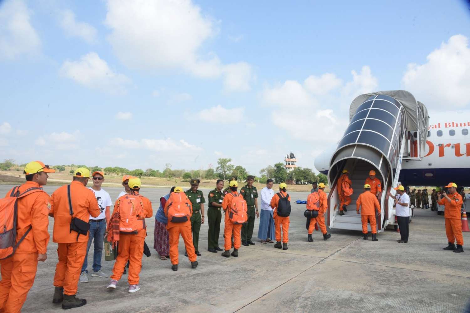 ဘူတန်ဘုရင့်နိုင်ငံ ဆေးဘက်ဆိုင်ရာအရေးပေါ်ကယ်ဆယ်ရေးအဖွဲ့မှ Dasho Tashi Wangyal ခေါင်းဆောင်သောအဖွဲ့ဝင် ၃၆ ဦးတို့သည် ဒုတိယအသုတ်အဖြစ် ယနေ့နံနက်ပိုင်းတွင် လေကြောင်းခရီးဖြင့် ဘူတန်ဘုရင့်နိုင်ငံသို့ ပြန်လည်ထွက်ခွာကြရာ နိုင်ငံခြားရေးဝန်ကြီးဌာနမှ သံအမတ်ကြီး ဦးကျော်ထွန်းနှင့် အမျိုးသားသဘာဝဘေးအန္တရာယ်ဆိုင်ရာစီမံခန့်ခွဲမှုကော်မတီမှ တာဝန်ရှိသူများက နေပြည်တော်လေဆိပ်၌ ပို့ဆောင်နှုတ်ဆက်ကြသည်။