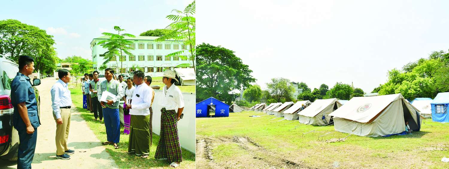 ထို့နောက် နိုင်ငံတော်စီမံအုပ်ချုပ်ရေးကောင်စီဥက္ကဋ္ဌ နိုင်ငံတော်ဝန်ကြီးချုပ်နှင့် အဖွဲ့ဝင်များသည် အမှတ်(၁) အခြေခံပညာ အထက်တန်းကျောင်းသို့ ရောက်ရှိကြပြီး ငလျင်ဘေးဒဏ် သင့်ပြည်သူများအား ယာယီကယ်ဆယ်ရေးစခန်း၌ နေရာချထားမှုများနှင့် စာသင်ဆောင်များ ထိခိုက်ပျက်စီးခဲ့ရမှု အခြေအနေများကို ကြည့်ရှုစစ်ဆေးကာ တာဝန်ရှိသူများ၏ တင်ပြချက်များအပေါ် ပြန်လည်ပြုပြင်၍ရနိုင်သေးသည့် ကျောင်းဆောင်များအား ကျောင်းဖွင့်ချိန်မတိုင်မီ စနစ်တကျ ပြန်လည်ပြုပြင်ပြီးစီးနိုင်ရေး ကြပ်မတ်ဆောင်ရွက်သွားရန်၊ ပြုပြင်၍မရသည့် အန္တရာယ်ရှိ ကျောင်းဆောင်များကို စနစ်တကျ ဖြိုချသွားရန်နှင့် အခြားလိုအပ်သည်များကို မှာကြားဖြည့်ဆည်း ဆောင်ရွက်ပေးသည်။