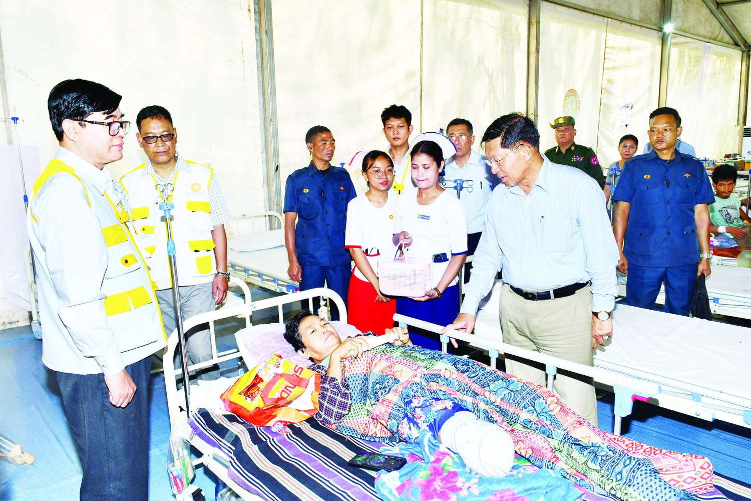 ထို့နောက် နိုင်ငံတော်စီမံ အုပ်ချုပ်ရေးကောင်စီ ဥက္ကဋ္ဌ နိုင်ငံတော်ဝန်ကြီးချုပ်နှင့် အဖွဲ့ဝင်များသည် စစ်ကိုင်းမြို့ ပြည်သူ့ဆေးရုံကြီးသို့ ရောက်ရှိကြပြီး ယာယီဆေးရုံအတွင်း ငလျင်ဘေးဒဏ်ကြောင့် ထိခိုက်ဒဏ်ရာရရှိခဲ့သည့် သံဃာတော်များ၊ သီလရှင် ဆရာလေးများနှင့် ဒေသခံပြည်သူများအား ဆေးဝါးကုသမှုဆောင်ရွက်ပေးနေမှုများနှင့် လိုအပ်သည့် ကျန်းမာရေးစောင့်ရှောက်မှုဆောင်ရွက် ပေးထားမှုများကို ကြည့်ရှု၍ အားပေးစကား ပြောကြားကာ ထိခိုက်ဒဏ်ရာရရှိ သူများအတွက် ထောက်ပံ့ငွေများနှင့် စားသောက်ဖွယ်ရာများကို ပေးအပ်သည်။