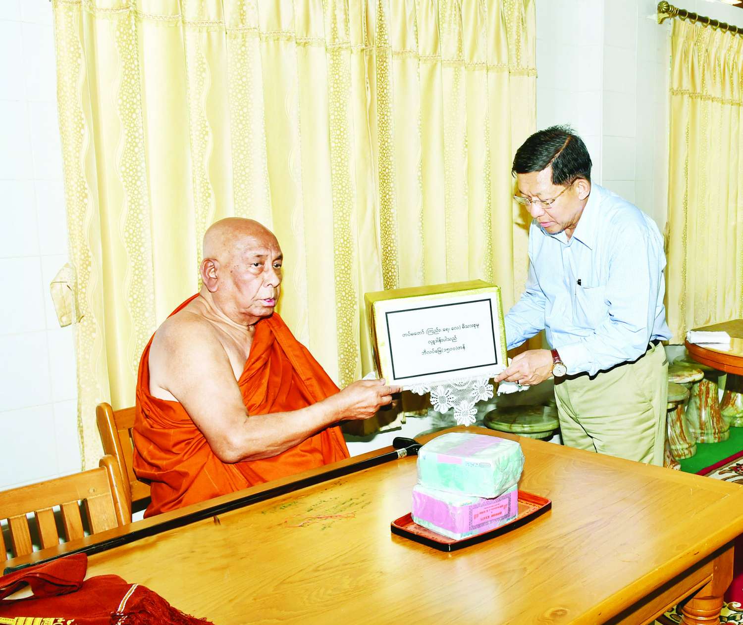 ထို့နောက် နိုင်ငံတော်စီမံအုပ်ချုပ်ရေးကောင်စီဥက္ကဋ္ဌ နိုင်ငံတော်ဝန်ကြီးချုပ်သည် ဇနီး ဒေါ်ကြူကြူလှနှင့် အဖွဲ့ဝင်များလိုက်ပါ၍ သီတဂူဝိပဿနာ ကျောင်းတိုက်သို့ ရောက်ရှိပြီး နိုင်ငံတော် ဩဝါဒါစရိယ သောဠသမ ရွှေကျင်သာသနာပိုင် ဆရာတော်၊ သီတဂူကမ္ဘာ့ဗုဒ္ဓ တက္ကသိုလ်များ၏ အဓိပတိ အဘိဓဇမဟာရဋ္ဌဂုရု အဘိဓဇ အဂ္ဂမဟာသဒ္ဓမ္မ ဇောတိက ဒေါက်တာ ဘဒ္ဒန္တ ဉာဏိဿရအား ဖူးမြော်ကြည်ညိုကာ ငလျင်ဘေးဒဏ်ကြောင့် ပြိုကျပျက်စီးမှုများ ဖြစ်ပေါ်ခဲ့ရသည့် မြတ်စွာဘုရားရှင် ၏ ဓာတ်တော် မွေတော်များကိန်းဝပ်ရာ ဘုရား၊ စေတီပုထိုးများ ပြုပြင်ထိန်းသိမ်းစောင့်ရှောက်ရေးလုပ်ငန်းများတွင် အသုံးပြုရန်အတွက် နိုင်ငံတော်စီမံအုပ်ချုပ် ရေးကောင်စီဥက္ကဋ္ဌ နိုင်ငံတော်ဝန်ကြီးချုပ်နှင့်ဇနီး မိသားစုက လှူဒါန်းသည့် အလှူငွေကျပ်သိန်း ၂၀၀ နှင့် တပ်မတော် (ကြည်း၊ ရေ၊ လေ)မိသားစုများက လှူဒါန်းသည့် ဘိလပ်မြေတန်ချိန် ၁၅၀၀ တို့ကို ဆက်ကပ်လှူဒါန်းသည်။ ယင်းနောက် လှူဒါန်းမှုအစုစုတို့အား ငလျင်သဘာဝဘေးကြောင့် အသက်ခန္ဓာဆုံးရှုံးခဲ့ရသည့် ရဟန်းသံဃာများ၊ သာသနာ့နွယ် ဝင်သီလရှင်များနှင့် ပြည်သူအပေါင်းတို့ရရှိစေရန် အမျှပေးဝေကြသည်။