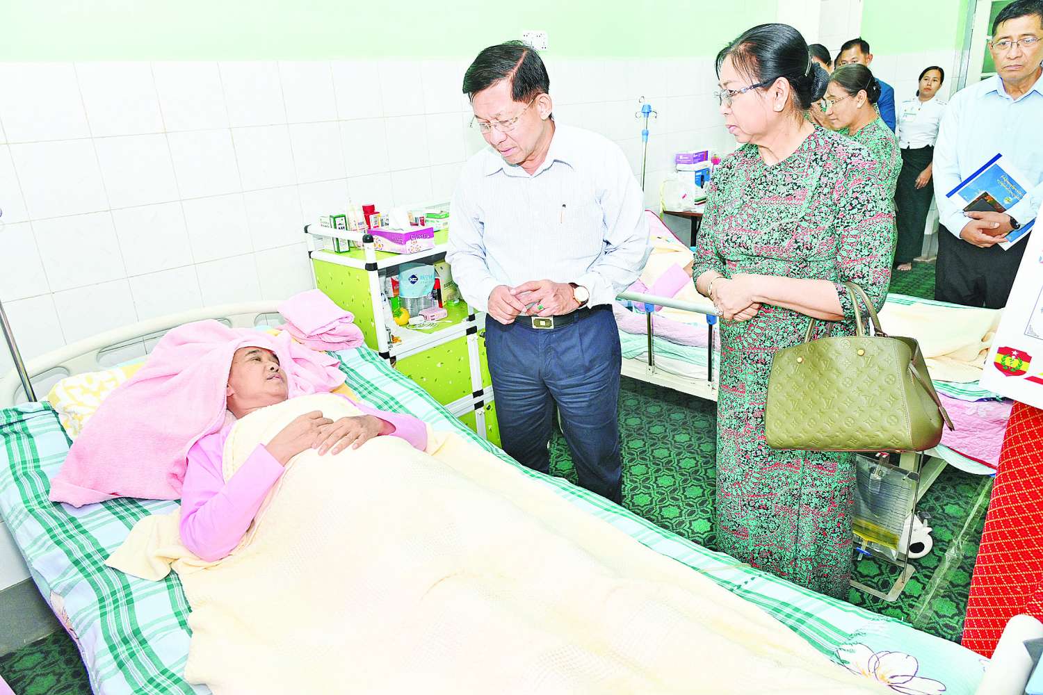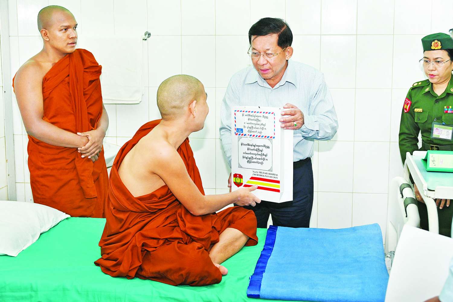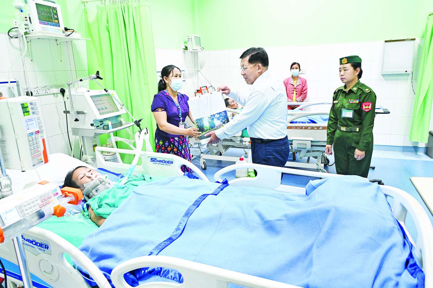 ထို့နောက် နိုင်ငံတော်စီမံအုပ်ချုပ်ရေးကောင်စီဥက္ကဋ္ဌ နိုင်ငံတော်ဝန်ကြီးချုပ်နှင့် ဇနီးတို့သည် ငလျင်ဘေးဒဏ်ကြောင့် ထိခိုက်ဒဏ်ရာရရှိခဲ့သဖြင့် ဆေးရုံအထူးကြပ်မတ် ကုသဆောင်အတွင်း ကုသမှုခံယူရလျက်ရှိသည့် ဆရာတော်တစ်ပါးနှင့် အရပ်သားပြည်သူ နှစ်ဦးတို့အား သွားရောက်ကြည့်ရှုအားပေးစကားပြောကြားပြီး အာဟာရဖြည့်စား သောက်ဖွယ်ရာများနှင့် နဝကမ္မအလှူတော်ငွေများကို ဆက်ကပ်လှူဒါန်းပေးအပ်သည်။