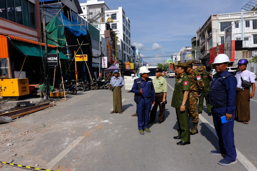 ထို့အတူ ကာကွယ်ရေးဦးစီးချုပ်ရုံး(ကြည်း)မှ ဒုတိယဗိုလ်ချုပ်ကြီး စိုးတင့်နိုင်နှင့် တာဝန်ရှိသူများသည် မန္တလေးမြို့၊ ချမ်းအေးသာစံမြို့နယ်အတွင်းရှိ ငလျင်ဒဏ်ကြောင့် ထိခိုက်ပျက်စီးခဲ့သည့် လမ်းဘေးဝဲ/ယာရှိအန္တရာယ်ရှိ အဆောက်အဦများ ဖယ်ရှားရှင်းလင်းခြင်း လုပ်ငန်းများနှင့် အမရပူရမြို့နယ်ရှိ သမိုင်းဝင်အောင်မြေ ရွှေကြက်ကျ ဆုတောင်းပြည့်မြတ်စွာဘုရာကြီး ထီးတော်ပြန်လည်ပြုပြင်ရန်အတွက်ပြင် ဆင်ထားရှိမှုများနှင့် ရွှေကူကြီးမြတ်စွာဘုရားအတွင်းရှိ ကျောင်းတိုက်များအား စက်ယန္တရားကြီးများအသုံးပြု၍ အရှိန်အဟုန်မြှင့် ဆောင်ရွက်နေမှုများကိုလည်းကောင်း ချမ်းမြသာစည်မြို့နယ်ရှိ ငလျင်ဒဏ်ကြောင့် ပြိုကျပျက်စီးခဲ့သော “အောင်” အီလက်ထရောနစ် ပစ္စည်းရောင်းဝယ်ရေးဆိုင်အား စက်ယန္တရားကြီးများဖြင့် ဖြိုဖျက်နေမှုအားလည်းကောင်း၊ အောင်မြေသာစံမြို့နယ်အတွင်းရှိကျုံး အနောက်စည်ရှည်တံခါးအားသွားရောက်၍ လုပ်ငန်းပြီးစီးမှုအခြေအနေများအား လည်းကောင်းကြည်ရှု့စစ်ဆေးပြီး လိုအပ်သည်များကို ပေါင်းစပ်ညှိနှိုင်းဆောင်ရွက်ပေးသည်။