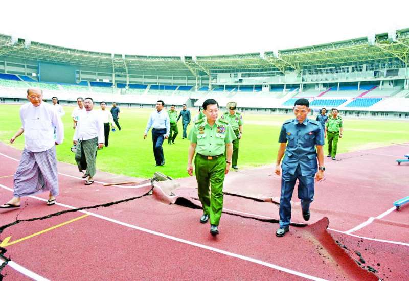 နိုင်ငံတော်စီမံအုပ်ချုပ်ရေးကောင်စီဥက္ကဋ္ဌ နိုင်ငံတော်ဝန်ကြီးချုပ် ဗိုလ်ချုပ်မှူးကြီး မင်းအောင်လှိုင်သည် ကောင်စီတွဲဖက်အတွင်းရေးမှူး ဗိုလ်ချုပ်ကြီး ရဲဝင်းဦးနှင့် အဖွဲ့ဝင်များ လိုက်ပါ၍ ယနေ့ညနေပိုင်းတွင် ၂၀၁၃ ခုနှစ်တွင် တည်ဆောက်ပြီးစီးဖွင့်လှစ်ခဲ့သည့် နေပြည်တော် ဝဏ္ဏသိဒ္ဓိအားကစားပြိုင်ကွင်း (Wunna Theikdi Sports Complex)အတွင်းရှိ အားကစားရုံ အဆောက်အအုံများ မန္တလေးငလျင်ကြီးကြောင့် ထိခိုက်ပျက်စီးခဲ့ရမှုများကို သွားရောက်ကြည့်ရှုစစ်ဆေးသည်။