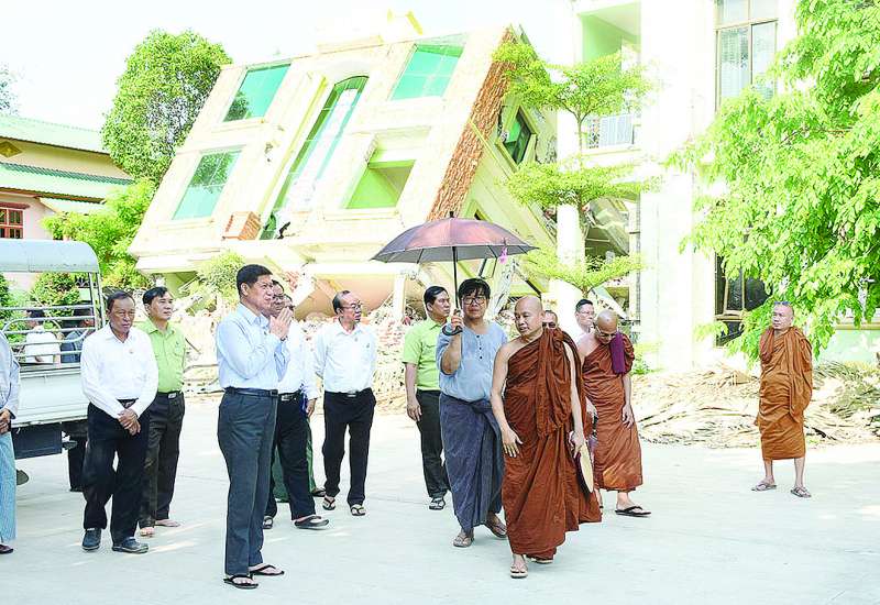 အဆောက်အအုံများ ပြန်လည်ပြုပြင်အသုံးပြုရေးနှင့် အသစ်တည်ဆောက်ရေးကြီးကြပ်မှုကော်မတီဥက္ကဋ္ဌ နိုင်ငံတော်စီမံအုပ်ချုပ်ရေးကောင်စီအဖွဲ့ဝင် ဗိုလ်ချုပ်ကြီး မောင်မောင်အေးနှင့် အဖွဲ့ဝင်များသည် ယနေ့နံနက်ပိုင်းတွင် ငလျင်ဒဏ်ကြောင့် ထိခိုက်ပျက်စီးခဲ့ရသည့် လျှပ်စစ်စွမ်းအားဝန်ကြီးဌာန၊ စိုက်ပျိုးရေး၊ မွေးမြူရေးနှင့်ဆည်မြောင်းဝန်ကြီးဌာန၊ ပြန်ကြားရေးဝန်ကြီးဌာနနှင့် သယံဇာတနှင့် သဘာဝပတ်ဝန်းကျင်ထိန်းသိမ်းရေးဝန်ကြီးဌာန၊ မဏိရတနာကျောက်စိမ်းခန်းမတို့သို့ သွားရောက်၍ ယာယီရုံးဖွင့်လှစ်ပြီး ရုံးလုပ်ငန်းဆောင်ရွက်မှုအခြေအနေများကို စစ်ဆေးခဲ့ကြောင်း သိရသည်။