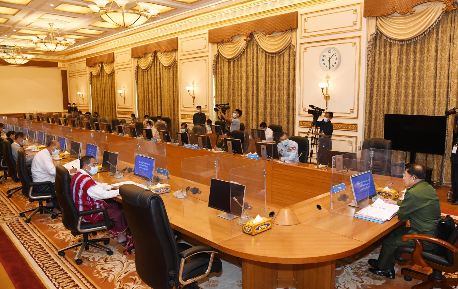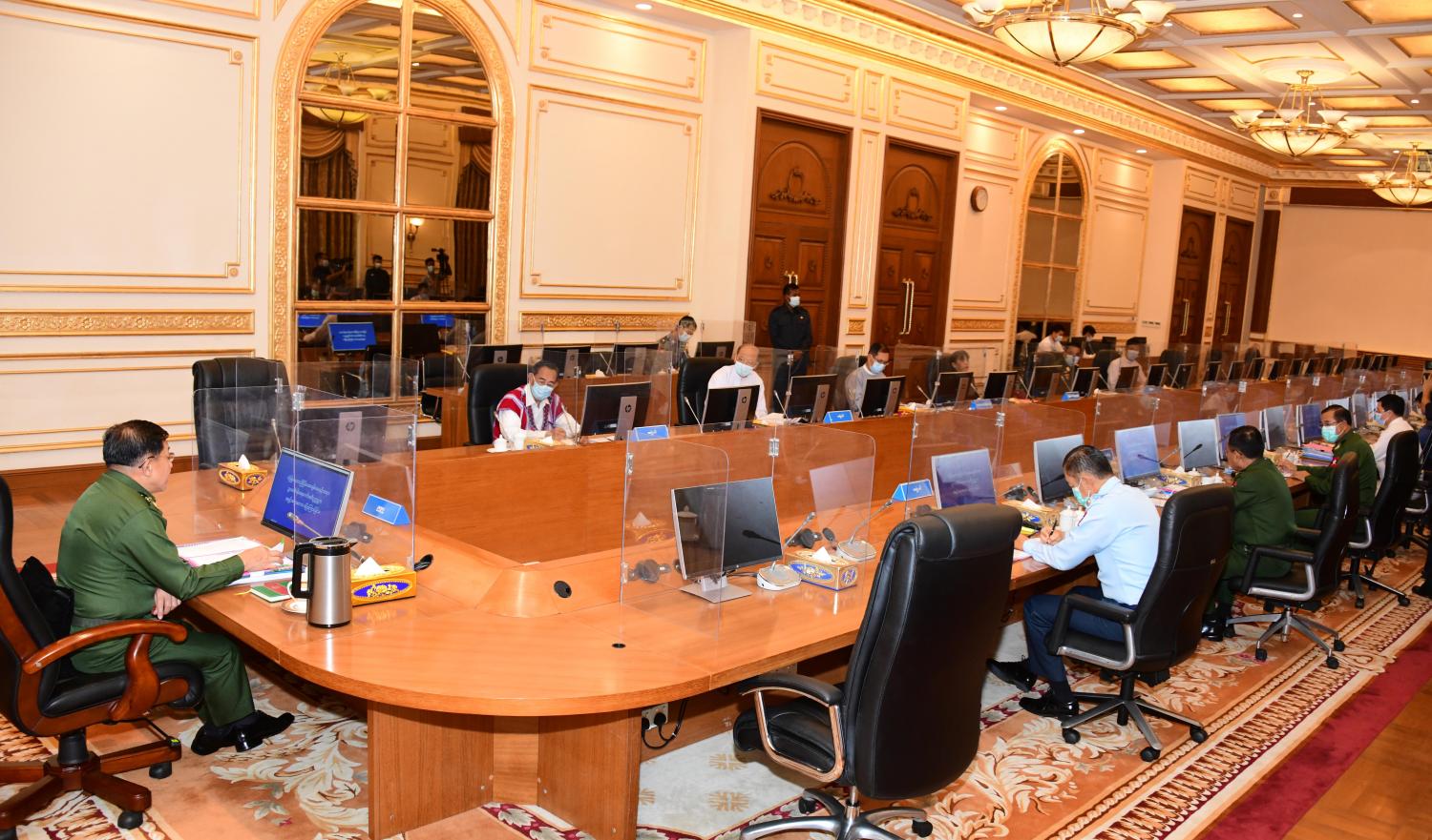 ထို့နောက် နိုင်ငံတော်စီမံအုပ်ချုပ်ရေးကောင်စီအဖွဲ့ဝင်များဖြစ်ကြသည့် မန်းငြိမ်းမောင် နှင့် Jeng Phang နော်တောင်၊ ပြည်ထောင်စုဝန်ကြီးများဖြစ်ကြသည့် ဦးခင်မောင်ရီနှင့် ဒုတိယဗိုလ်ချုပ်ကြီး ထွန်းထွန်းနောင်၊ ပြည်ထောင်စုရှေ့နေချုပ် ဒေါက်တာ ဒေါ်သီတာဦး တို့က ရပ်ကွက်၊ ကျေးရွာ စီမံခန့်ခွဲရေးကောင်စီများတွင် ရပ်ရွာတည်ငြိမ်အေးချမ်းရေးနှင့် တရားဥပဒေစိုးမိုးရေးအတွက် ဌာနဆိုင်ရာ ဝန်ထမ်းများပါ ထည့်သွင်းဖွဲ့စည်းရေး၊ ခရိုင်၊ မြို့နယ်၊ ရပ်ကွက်၊ ကျေးရွာအုပ်ချုပ်ရေး ကောင်စီများ အဖွဲ့ဝင်များနှင့် ရပ်ကျေးဥက္ကဋ္ဌများ တာဝန်ပေးအပ်ရာတွင် ဒေသတည်ငြိမ်အေးချမ်းရေး အတွက် ဆောင်ရွက်နိုင်သူများကို ရွေးချယ်ခန့်အပ်ရေး၊ သက်ဆိုင်ရာကောင်စီအဆင့်ဆင့် အထောက် အကူပြုရေးအဖွဲ့များ ဖွဲ့စည်းပေးရေး၊ CDM ဆောင်ရွက်မှုတွင် မပါဝင်သူများအား အကာအကွယ်ပေးရေး၊ ပတ်ဝန်းကျင်စိမ်းလန်းစိုပြည်ရေး၊ ကြိုးဝိုင်း၊ ကြိုးပြင်သဘာဝဘေးမဲ့တောများ တည်ထောင်ရေး၊ ကျေးရွာသုံး ထင်းစိုက်ခင်းများ တည်ထောင်ရေး၊ ပုဂ္ဂလိက သစ်တော စိုက်ခင်းများ စိုက်ပျိုးခြင်းမရှိပါက ပြန်လည်သိမ်းဆည်းသွားရေး၊ သစ်တောကျူးများ စာရင်းကောက်ယူပြီး သစ်တောကြိုးဝိုင်းအတွင်းမှ ပယ်ဖျက်သွားရေး၊ သီးနှံသစ်တော ရောနှောစိုက်ခင်း တည်ထောင်ရေး၊ ရပ်ရွာတည်ငြိမ်အေးချမ်းရေးနှင့် တရားဥပဒေစိုးမိုးရေးအတွက် အထောက်အကူပြုအဖွဲ့များ ဖွဲ့စည်းဆောင်ရွက်သွားမည့် အစီအစဉ် များကို ရှင်းလင်းဆွေးနွေးတင်ပြကြသည်။