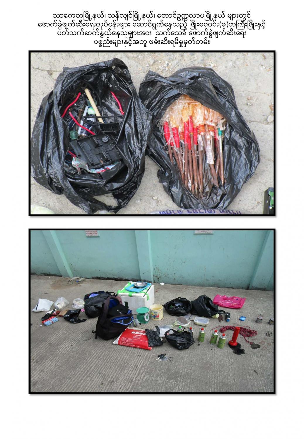 အခြားဖမ်းဆီးထိန်းသိမ်းထားသူများ၏ ထွက်ဆိုချက်အရ ဧပြီ ၂၉ ရက်တွင် ကျော်ကိုကို၊ ၃၅ နှစ်၊ (ဘ)ဦးတင်ဝင်းကို တောင်ဥက္ကလာပမြို့နယ်ရှိ ၎င်း၏နေအိမ်၌ လက်လုပ်ဗုံး ၁ လုံး၊ ယမ်းပျော့ ၇ တောင့်၊ ဒီတိုနေတာ ၈ ခု၊ ယမ်းကြိုး ၇ ပေခွဲဖြင့် လည်းကောင်း၊ သန်းထက်ကိုကို၊ ၃၁ နှစ်၊ (ဘ)ဦးသန်းဦးကို မီးခိုးဗုံး ၁၀ လုံးပါ ပါကင် ၁ ဗူး၊ ယမ်းမှုန့် ၃၀ ကျပ်သားခန့် ၁ ဗူးအပါအဝင် အကြမ်းဖက်ရာတွင် အသုံးပြုသည့် ပစ္စည်းများနှင့်အတူ ဖမ်းဆီးရမိခဲ့ပြီး ခန့်စည်သူ၊ ၂၅ နှစ်၊ (ဘ)ဦးသန်းနိုင်ကို လည်းကောင်း၊ ဖြိုးမောင်မောင်ဟိန်း၊ ၂၄ နှစ်၊ (ဘ)ဦးဇော်ဟိန်းကို လက်လုပ်ဗုံး ၃ လုံးဖြင့် လည်းကောင်း၊ ဟိန်းဝေယံ၊ ၂၁ နှစ်၊ (ဘ)ဦးမြကြိုင်နှင့် ဝေလင်းထွန်း၊ ၃၅ နှစ်၊ (ဘ) ဦးသိန်းထွန်းတို့ကို မီးခိုးဗုံး ၅၅ လုံးအပါအဝင် အကြမ်းဖက်ရာတွင် အသုံးပြုသည့် ပစ္စည်းများနှင့်အတူ ထပ်မံဖမ်းဆီးရမိခဲ့ပြီး စစ်ကြောဖော်ထုတ်ချက်များအရ တရားခံ ခန့်စည်သူနှင့် အဖွဲ့ဝင်များသည် တောင်ဥက္ကလာပမြို့နယ်ရှိ Wa Ha Ha ဖုန်းနှင့် ဆက်စပ်ပစ္စည်းအရောင်းဆိုင်အား လက်လုပ်မိုင်းဖြင့် ဖောက်ခွဲဖျက်ဆီးရေး ဆောင်ရွက် ခဲ့ကြောင်း သိရှိရသည်။