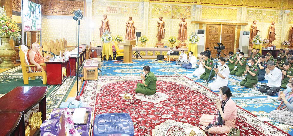ထို့နောက် နိုင်ငံတော်စီမံအုပ်ချုပ်ရေးကောင်စီဥက္ကဋ္ဌ တပ်မတော် ကာကွယ်ရေး ဦးစီးချုပ်နှင့်ဇနီး၊ အဖွဲ့ဝင်များသည် ဆရာတော်ကြီးထံမှ ငါးပါးသီလခံယူ ဆောက်တည်၍ အနုမောဒနာတရား နာယူကြပြီး ရေစက်သွန်းချ အမျှပေးဝေကြ သည်။ ယင်းနောက် နိုင်ငံတော်စီမံအုပ်ချုပ်ရေးကောင်စီဥက္ကဋ္ဌ တပ်မတော် ကာကွယ်ရေး ဦးစီးချုပ်နှင့်ဇနီးနှင့် အဖွဲ့ဝင်များက ဆရာတော်ကြီးထံ လှူဖွယ်ပစ္စည်းများ ဆက်ကပ်လှူဒါန်းရာ ဓမ္မလက်ဆောင်များ ပြန်လည်ပေးအပ်ခဲ့ကြောင်း သတင်းရရှိသည်။