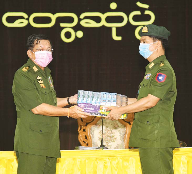 တွေ့ဆုံပွဲအပြီးတွင် နိုင်ငံတော်စီမံအုပ်ချုပ်ရေးကောင်စီဥက္ကဋ္ဌ၊ တပ်မတော် ကာကွယ်ရေး ဦးစီးချုပ်က စားသောက်ဖွယ်ရာပစ္စည်းများကို ပေးအပ်ရာ တိုင်းမှူးက လက်ခံရယူသည်။ ယင်းနောက် နိုင်ငံတော်စီမံအုပ်ချုပ်ရေးကောင်စီဥက္ကဋ္ဌ၊ တပ်မတော် ကာကွယ်ရေးဦးစီးချုပ်၏ ဇနီးက တပ်နယ် မိခင်နှင့် ကလေးအသင်းအတွက် ချီးမြှင့်ငွေ များကို ပေးအပ်ရာ တိုင်းမှူး၏ ဇနီးက လက်ခံရယူသည်။