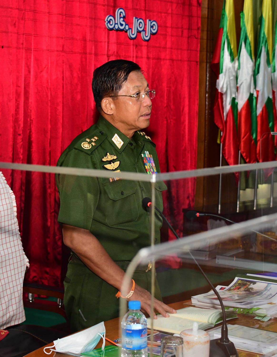 တွေ့ဆုံပွဲအပြီးတွင် နိုင်ငံတော်စီမံအုပ်ချုပ်ရေးကောင်စီ ဥက္ကဋ္ဌ တပ်မတော် ကာကွယ်ရေးဦးစီးချုပ်က တက်ရောက်လာကြသည့် ကောင်စီအဖွဲ့ဝင်များနှင့် ဌာနဆိုင်ရာ တာဝန်ရှိသူများအား ရင်းရင်းနှီးနှီး နှုတ်ဆက်သည်။